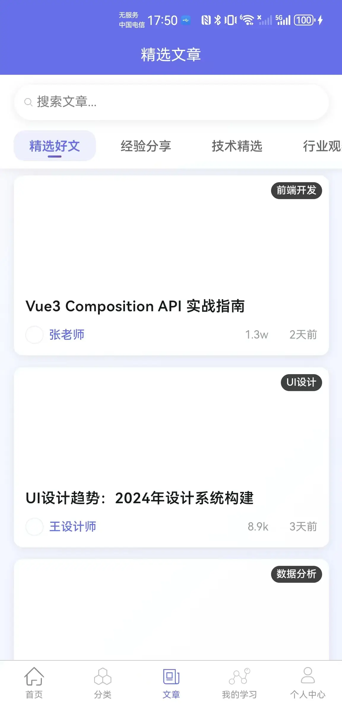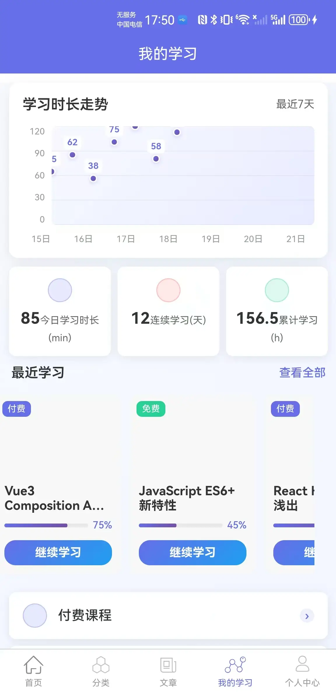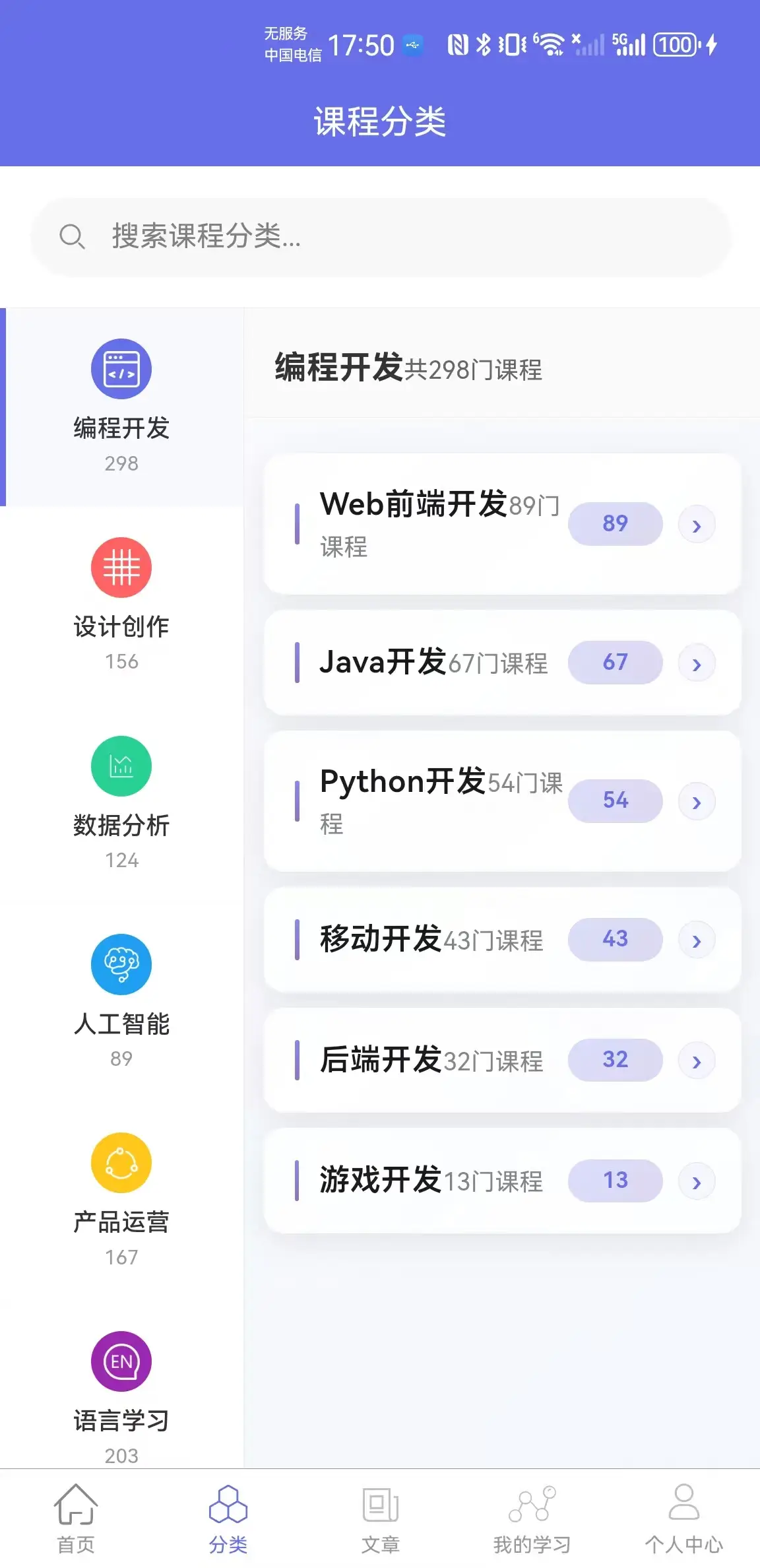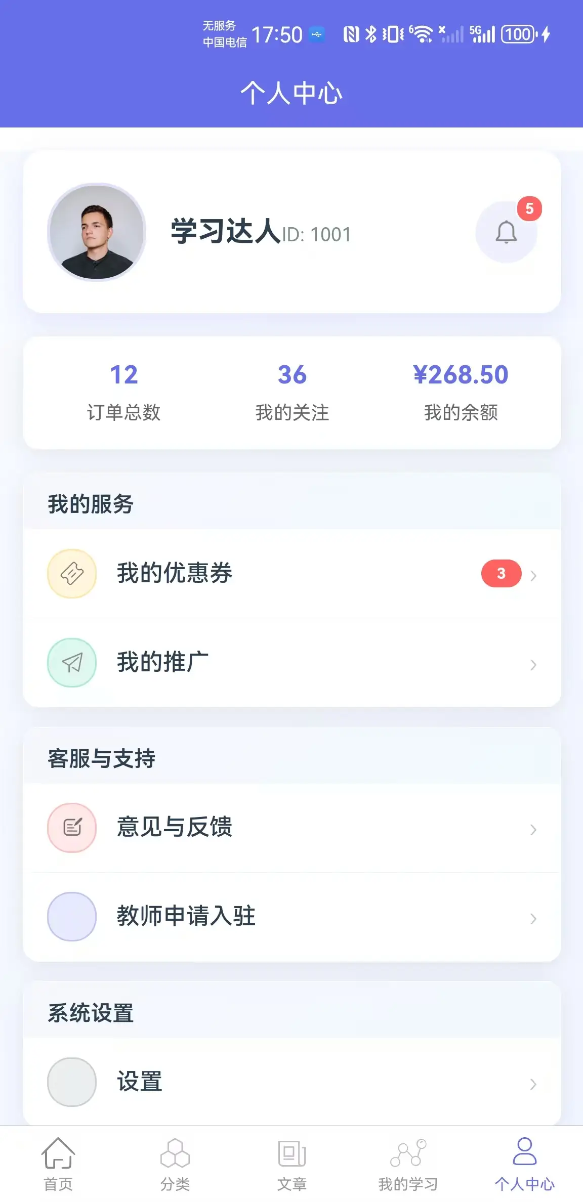 这里一个在线教育APP,可用来选课、学习、下单购买课程等 1.主要分为5大模块首页、分类、文章、我的学习、个人中心 2.首页包括:轮播图、分类、文章、我的学习、个人中心 3.分类:可进行课程选择 4.文章:精选文章,点击可看详情页 5.我的学习:学习趋势,学习工时等 6.个人中心:个人信息、订单、优惠券、推广等