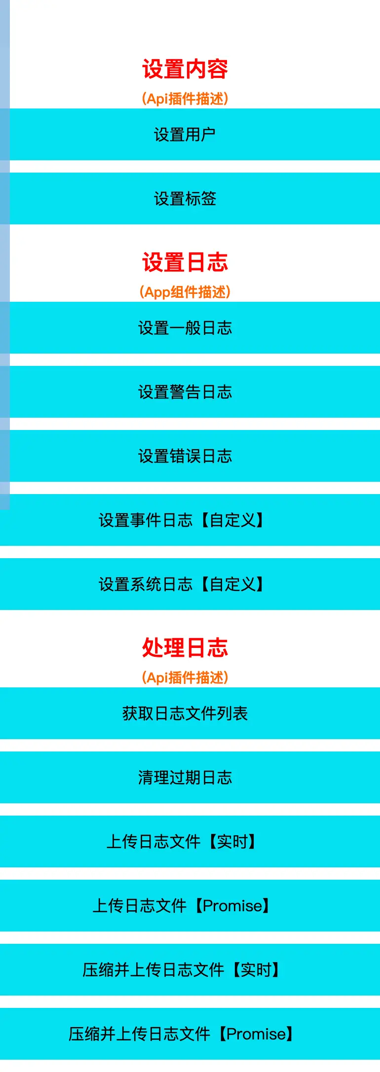 自动收集应用日志、设置用户、设置标签、设置一般日志、设置警告日志、设置错误日志、设置事件日志、设置系统日志、获取日志文件列表、清理过期日志、上传日志文件、压缩并上传日志文件方法
