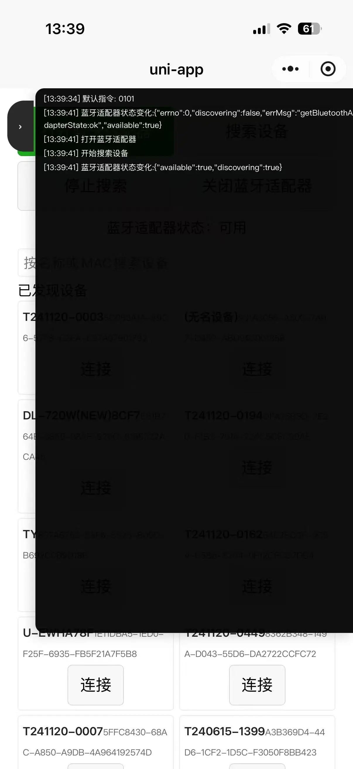 import、on/off订阅事件、调用简单的API(open/start/stop/connect/write),几行代码即可完成完整蓝牙调试流程; - 模块已提供充分日志与 defensive 处理(例如在