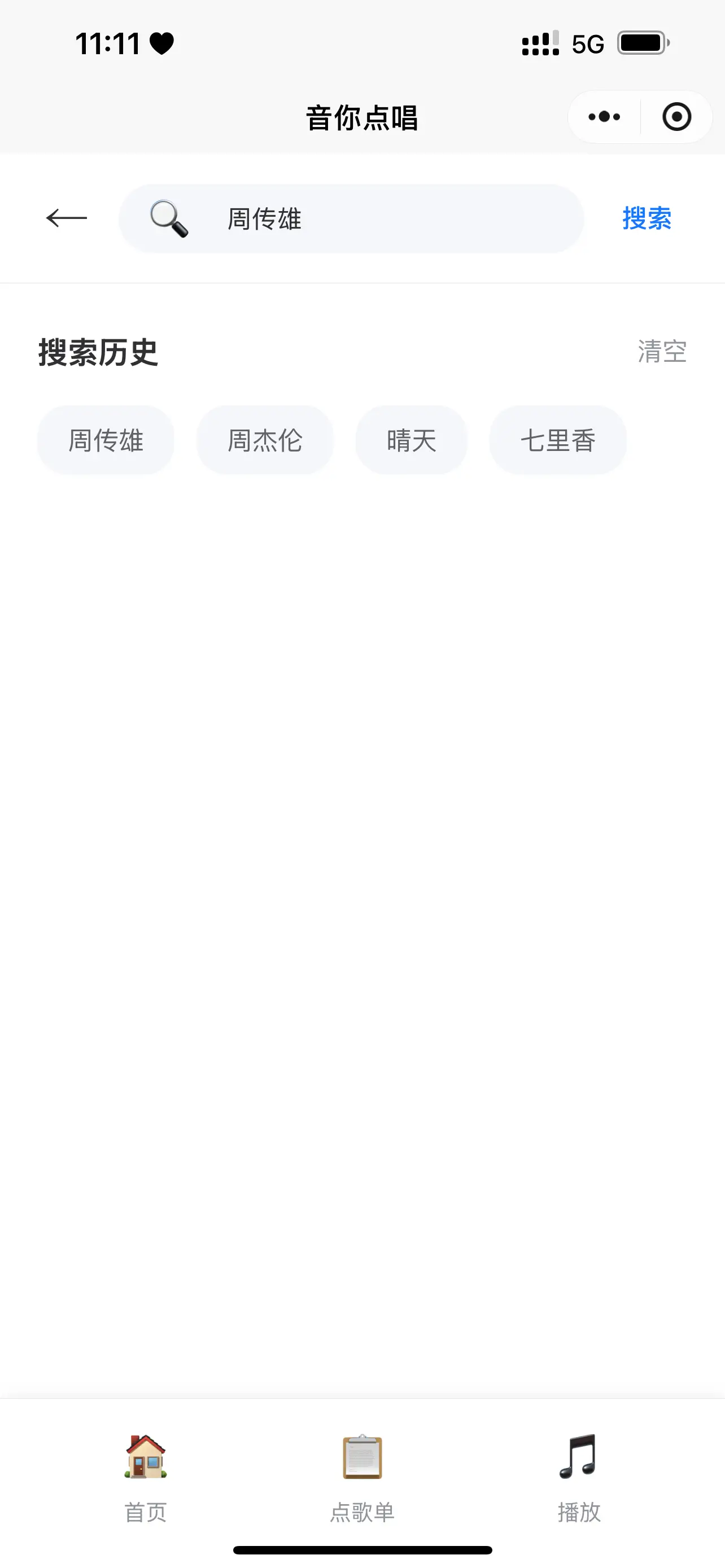 ✨ 主要功能 🔍 智能搜索:支持歌曲/歌手关键词搜索,智能历史记录管理 🎵 一键点歌:从热门推荐或搜索结果快速添加歌曲到点歌单 ▶️ 播放控制:模拟播放器,支持播放/暂停、进度条拖拽、歌曲切换 📋 列表管理:查看点歌单、单曲删除、全列表清空 🏷️ 分类浏览:按音乐类型(如派对、抒情、摇滚)筛选推荐 💬 用户反馈:Toast 提示和模态框确认,提升交互体验 🛠️ 技术栈