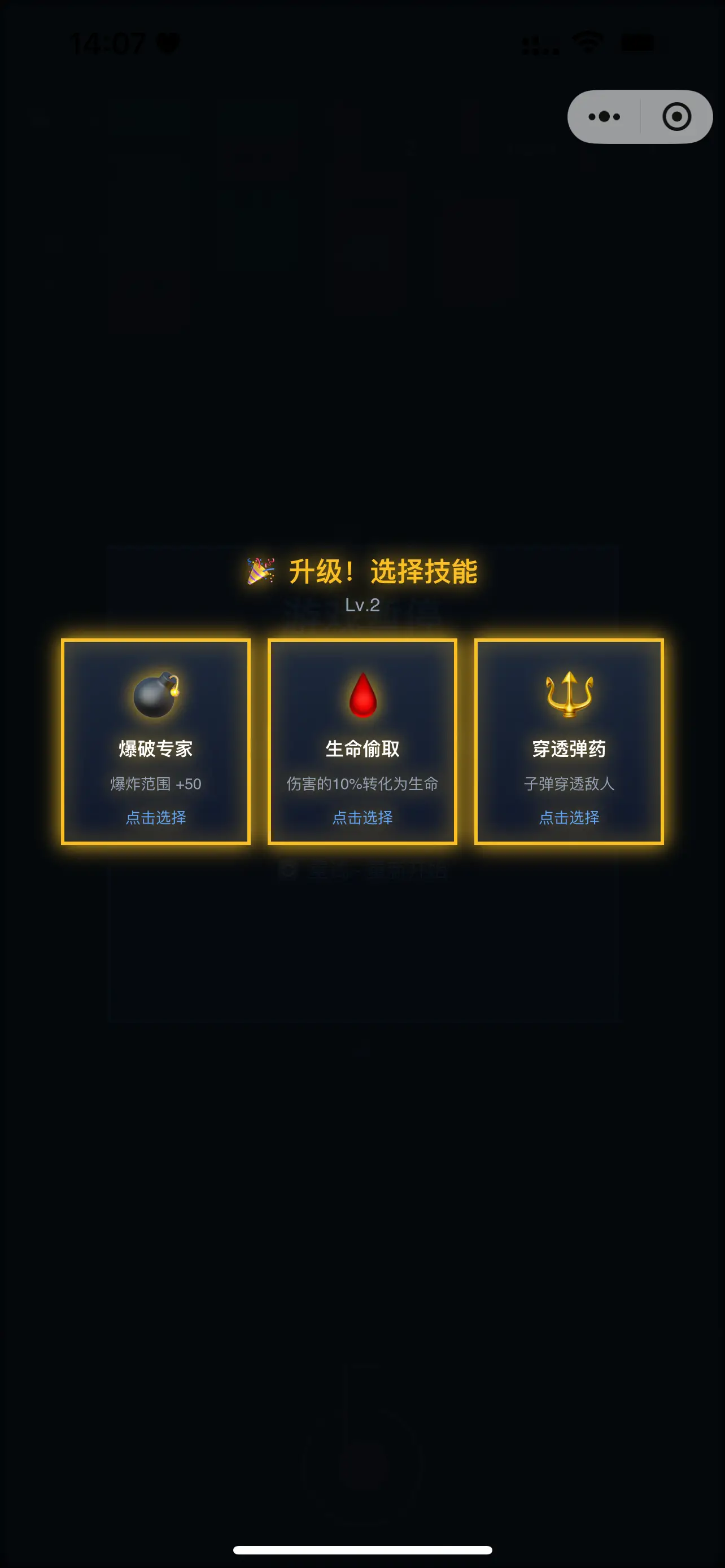 - 技能选择:升级时点击屏幕选择3个技能之一