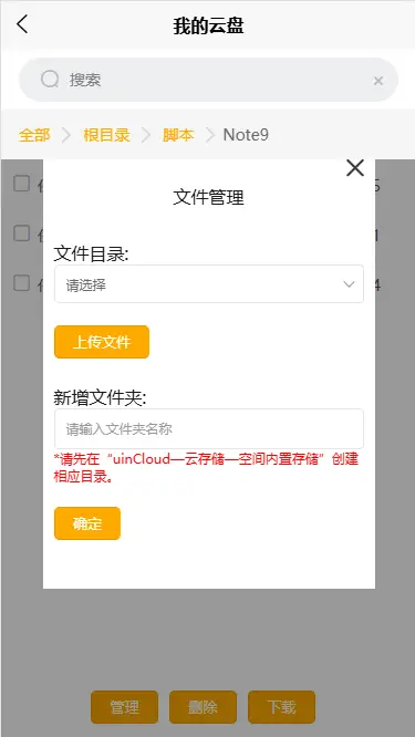 uniCloud内置存储功能(移动端),可以用于个人云盘使用。须先在“uinCloud—云存储—空间内置存储”创建相应目录,然后在插件中创建相应的文件夹才可以进行管理