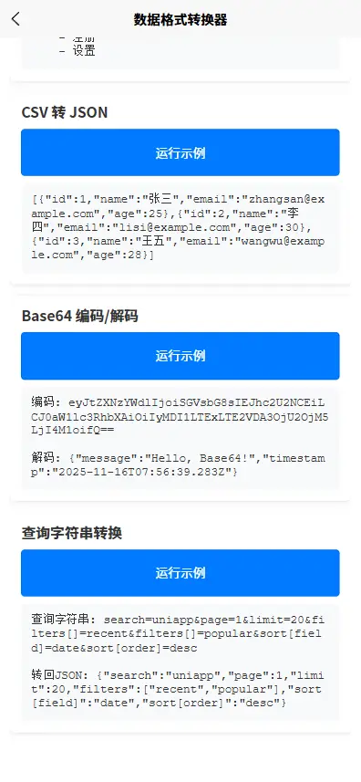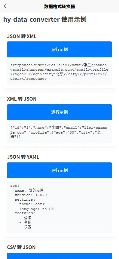 一个功能强大的数据格式转换 uni-app 插件,支持 JSON、XML、YAML、CSV、查询字符串、Base64 等多种格式的相互转换。
