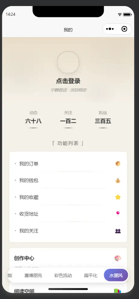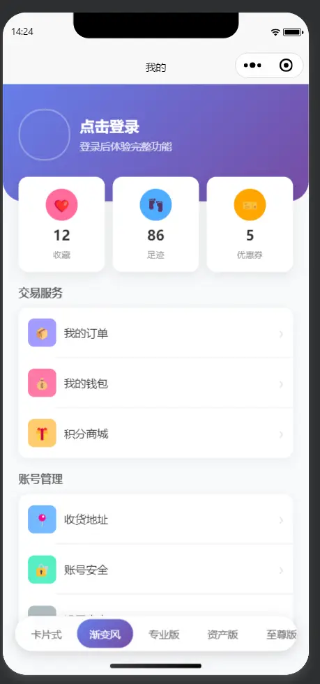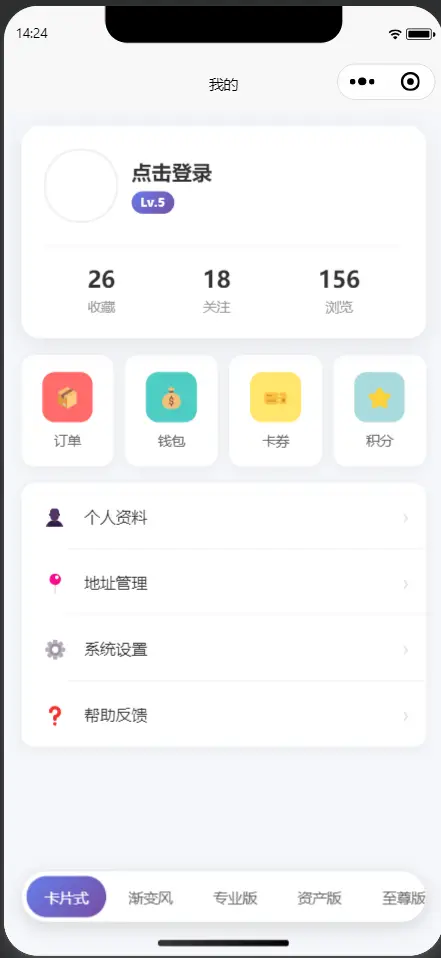 3. **预览模板**:运行后在 `pages/my/my.vue` 中已集成所有模板,通过底部切换栏可以实时预览不同风格