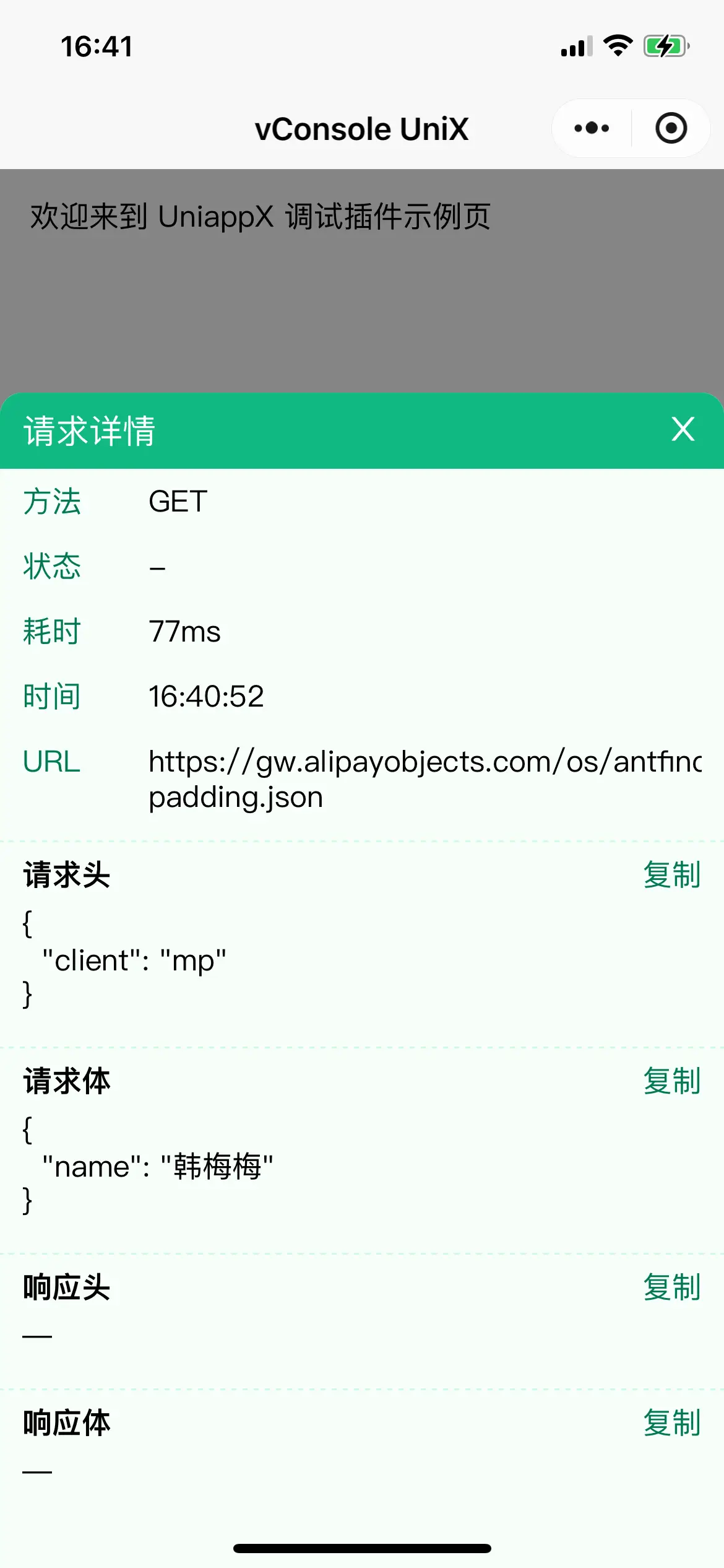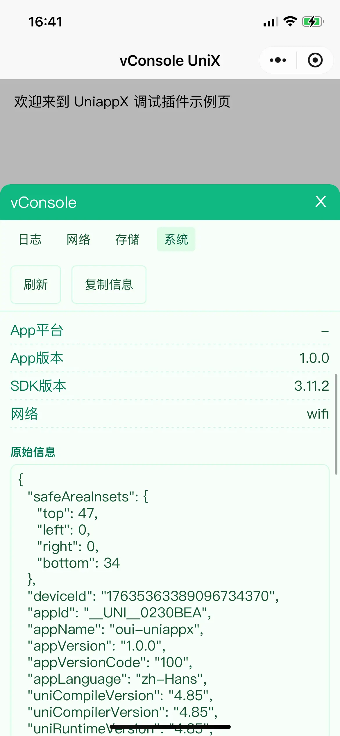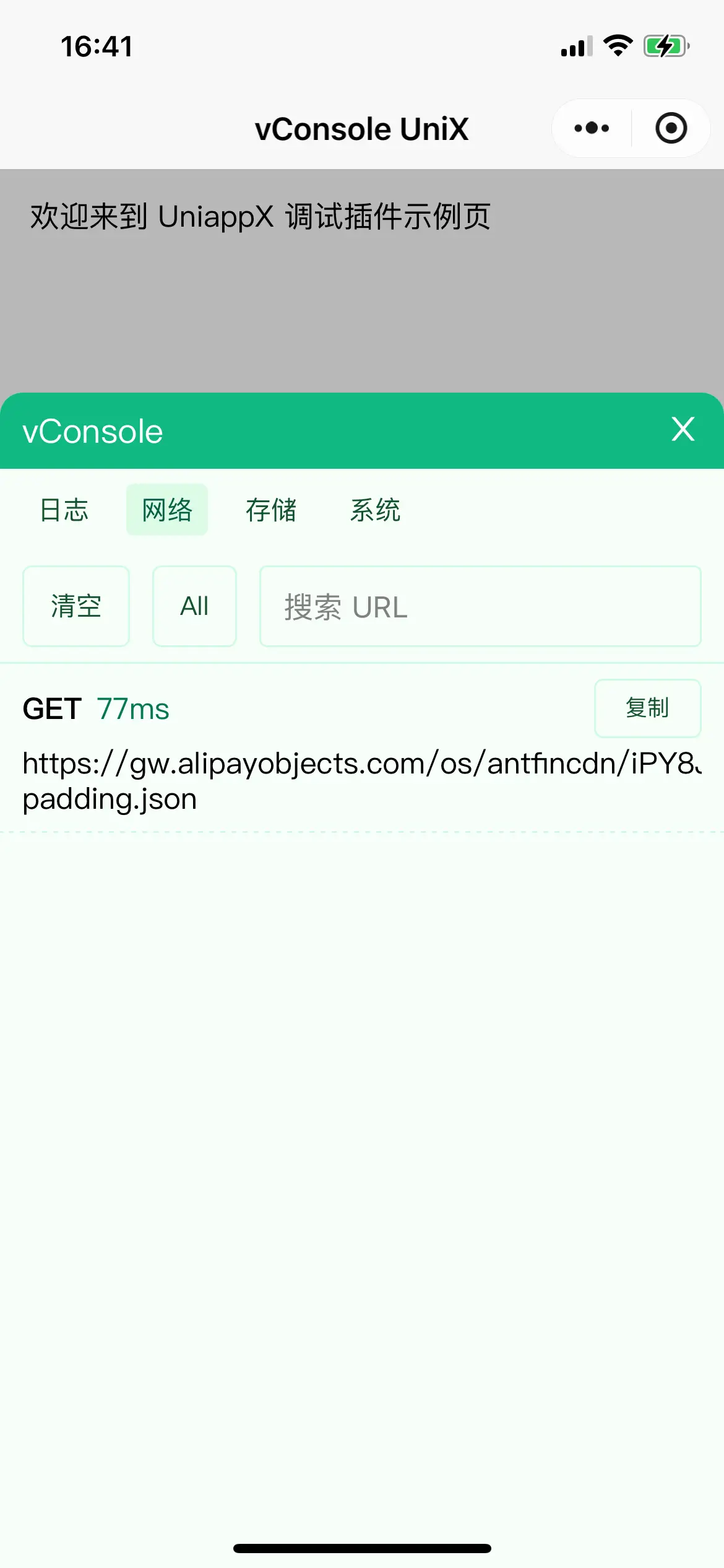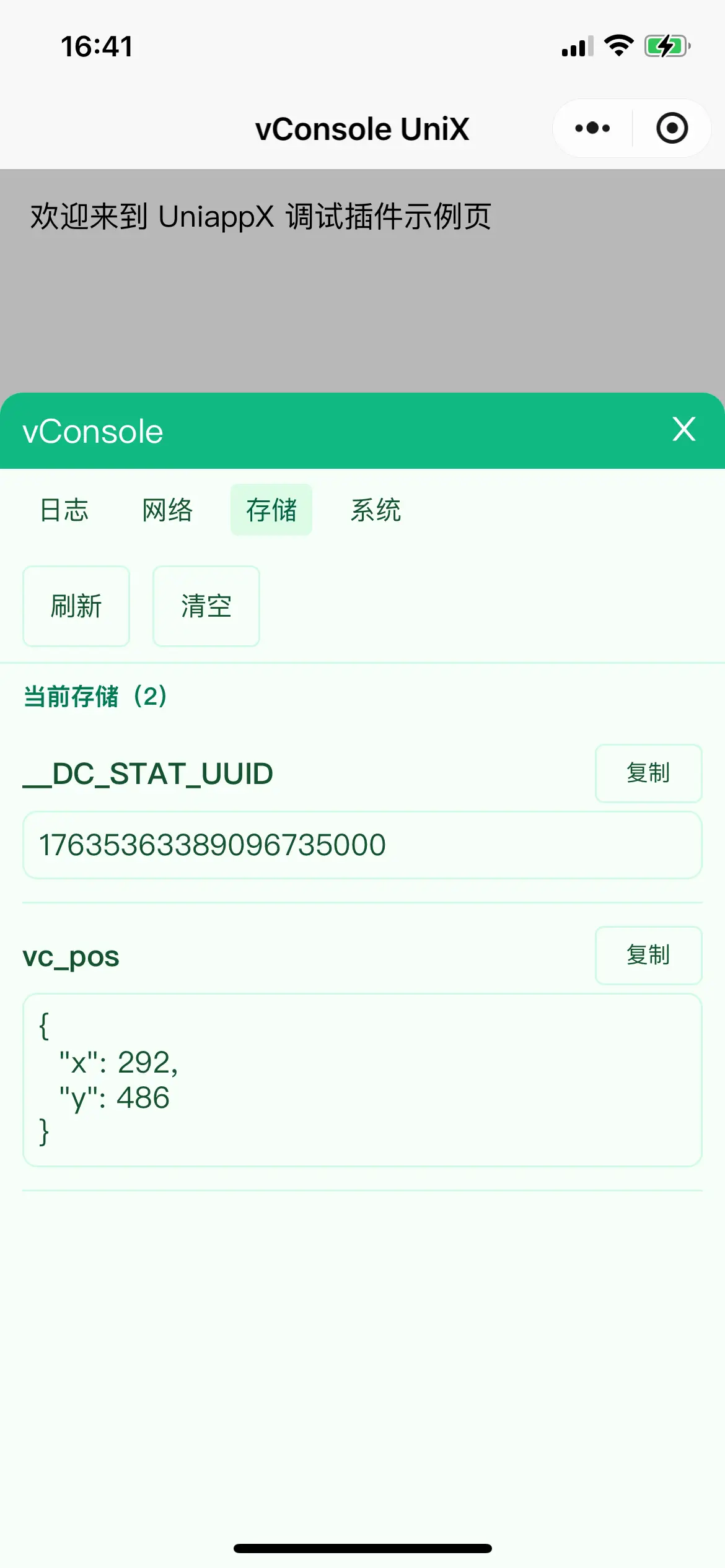 一个面向 UniApp X 的可视化调试面板,提供日志捕获、网络请求抓取、存储查看与系统信息展示,内置悬浮按钮,随时唤起调试界面。