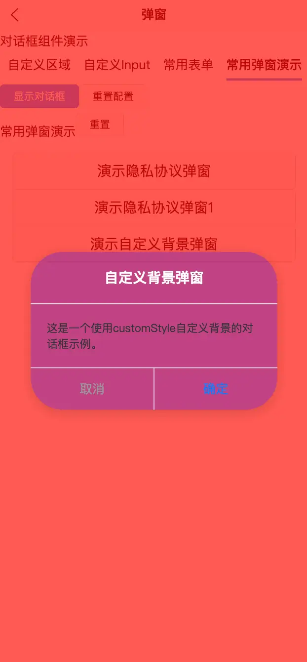 title:对话框标题content:对话框内容type:对话框类型,可选值:default、loadingshowCancel:是否显示取消按钮,默认 truecancelText:取消按钮文本,默认 "取消"confirmText:确认按钮文本,默认 "确定"cancelColor:取消按钮颜色,默认 "#999999"confirmColor:确认按钮颜色,默认 "#007AFF"maskClosable:点击遮罩层是否可关闭,默认 trueshowButtons:是否显示按钮区域,默认 truewidth:对话框宽度height:对话框高度position:对话框位置,可选值:center、top、bottom、left、rightanimationDuration:动画持续时间extras:自定义数据,会在回调中返回topArea:顶部自定义区域配置titleArea:标题区域配置contentArea:内容区域配置bottomArea:底部自定义区域配置outerTopArea:外部顶部区域配置outerBottomArea:外部底部区域配置titleStyle:标题样式对象cancelButtonStyle:取消按钮样式对象confirmButtonStyle:确认按钮样式对象customStyle:自定义样式字符串,直接添加到style标签中maskStyle:遮罩层样式对象,用于自定义遮罩层背景色、透明度等dialogStyle:对话框样式对象,用于自定义对话框背景色、颜色、圆角等showScrollbar:是否显示滚动条,默认 truescrollbarWidth:滚动条宽度,默认 "4px"scrollbarColor:滚动条颜色,默认 "rgba(0, 0, 0, 0.2)"scrollbarTrackColor:滚动条轨道颜色,默认 "transparent"scrollbarBorderRadius:滚动条圆角,默认 "2px"closeOnConfirm:确认后是否自动关闭,默认 trueevents:自定义事件配置,格式:[{selector, eventType, action, autoCloseDialog, extras}]useModalArea:是否使用modalArea替代整个对话框内容modalArea:自定义模态区域配置,包含content和style属性useOuterTopArea:是否使用外部顶部区域useOuterBottomArea:是否使用外部底部区域leftArea:左侧区域配置(用于flex布局),包含content和style属性rightArea:右侧区域配置(用于flex布局),包含content和style属性useFallback:是否直接使用兜底方案,默认falsesuccess:成功回调函数fail:失败回调函数complete:完成回调函数
