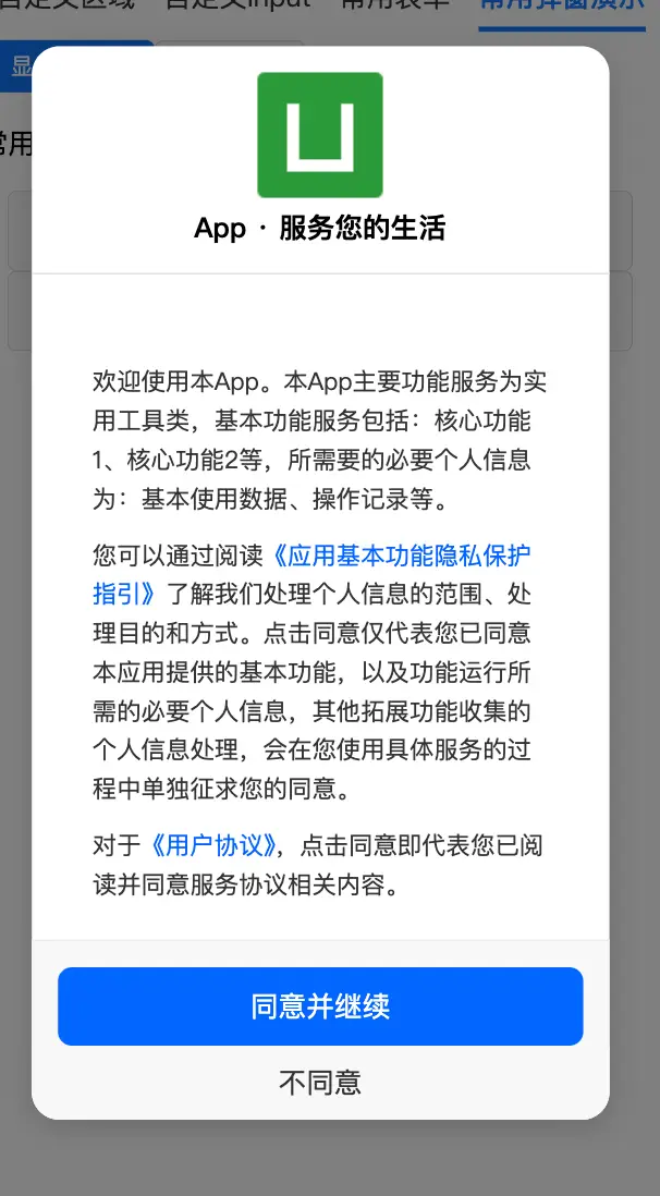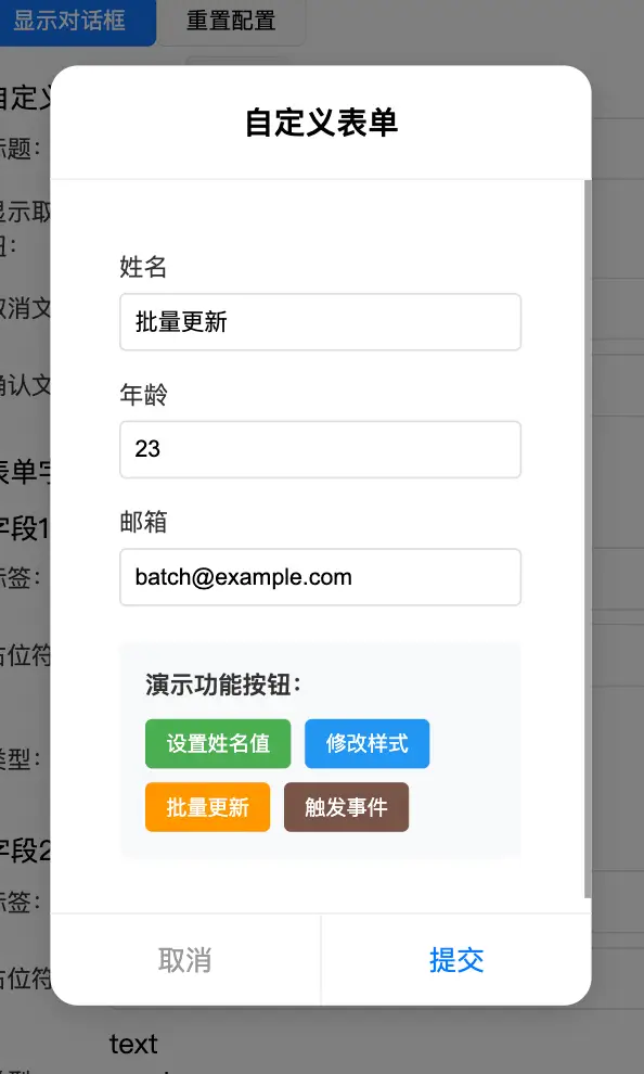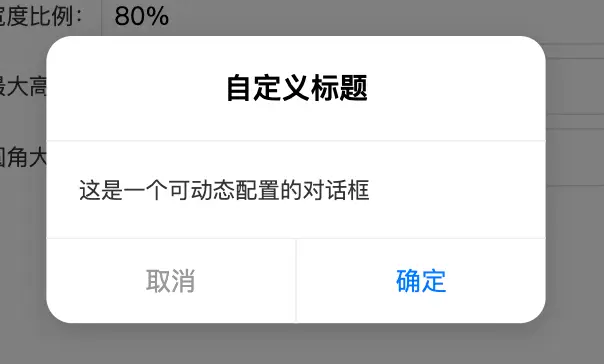 title:对话框标题content:对话框内容type:对话框类型,可选值:default、loadingshowCancel:是否显示取消按钮,默认 truecancelText:取消按钮文本,默认 "取消"confirmText:确认按钮文本,默认 "确定"cancelColor:取消按钮颜色,默认 "#999999"confirmColor:确认按钮颜色,默认 "#007AFF"maskClosable:点击遮罩层是否可关闭,默认 trueshowButtons:是否显示按钮区域,默认 truewidth:对话框宽度height:对话框高度position:对话框位置,可选值:center、top、bottom、left、rightanimationDuration:动画持续时间extras:自定义数据,会在回调中返回topArea:顶部自定义区域配置titleArea:标题区域配置contentArea:内容区域配置bottomArea:底部自定义区域配置outerTopArea:外部顶部区域配置outerBottomArea:外部底部区域配置titleStyle:标题样式对象cancelButtonStyle:取消按钮样式对象confirmButtonStyle:确认按钮样式对象customStyle:自定义样式字符串,直接添加到style标签中showScrollbar:是否显示滚动条,默认 truescrollbarWidth:滚动条宽度,默认 "4px"scrollbarColor:滚动条颜色,默认 "rgba(0, 0, 0, 0.2)"scrollbarTrackColor:滚动条轨道颜色,默认 "transparent"scrollbarBorderRadius:滚动条圆角,默认 "2px"closeOnConfirm:确认后是否自动关闭,默认 trueevents:自定义事件配置,格式:[{selector, eventType, action, autoCloseDialog, extras}]useModalArea:是否使用modalArea替代整个对话框内容modalArea:自定义模态区域配置,包含content和style属性useOuterTopArea:是否使用外部顶部区域useOuterBottomArea:是否使用外部底部区域leftArea:左侧区域配置(用于flex布局),包含content和style属性rightArea:右侧区域配置(用于flex布局),包含content和style属性success:成功回调函数fail:失败回调函数complete:完成回调函数