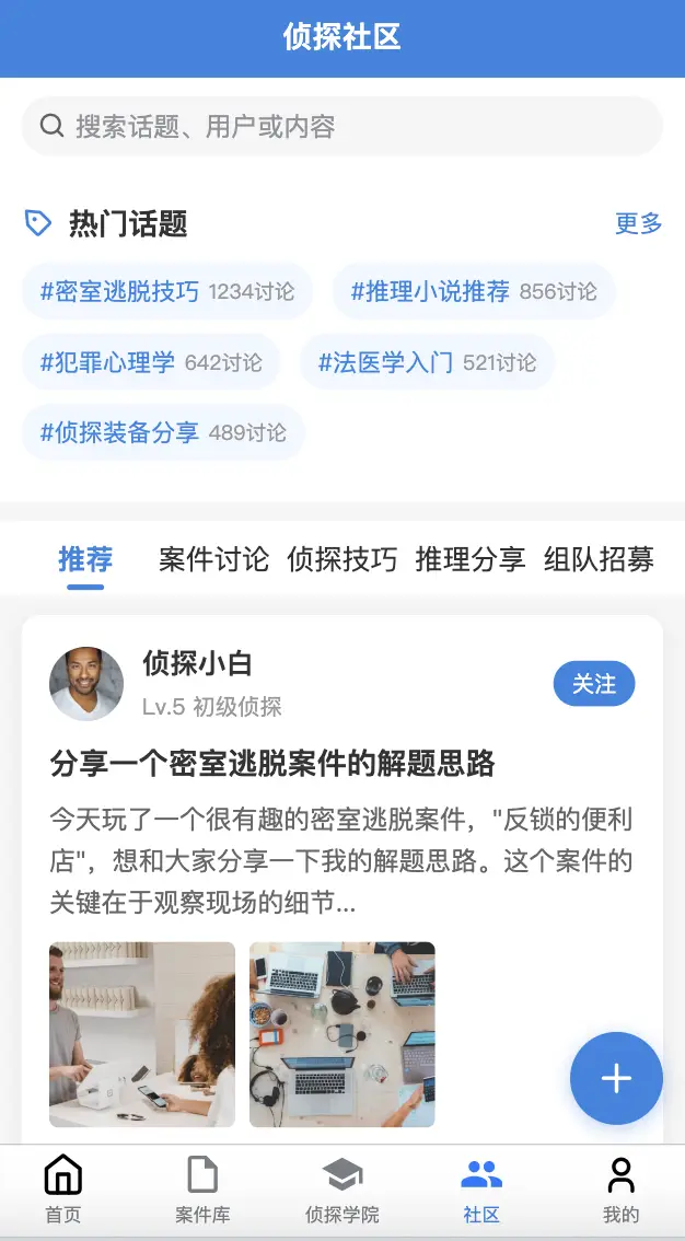 - 社区 - 案件讨论、经验分享、组队功能