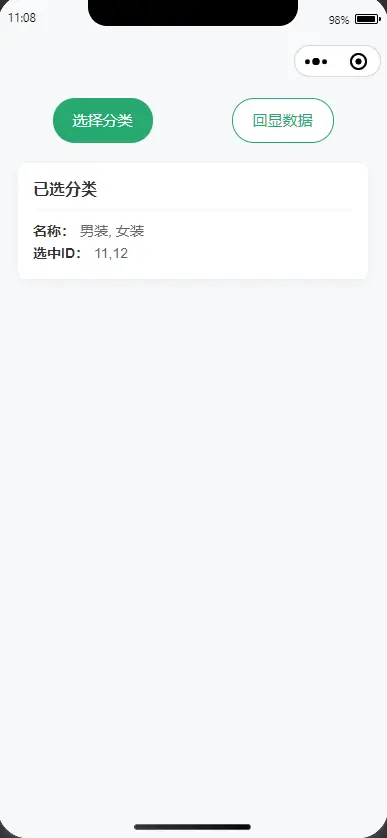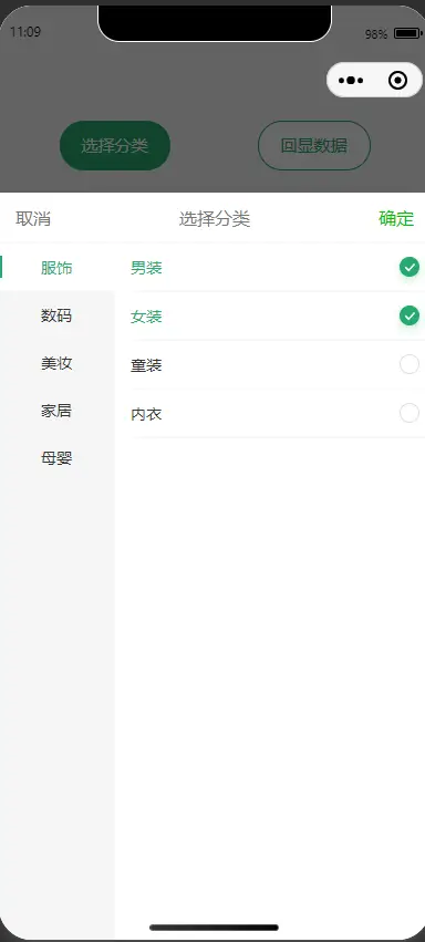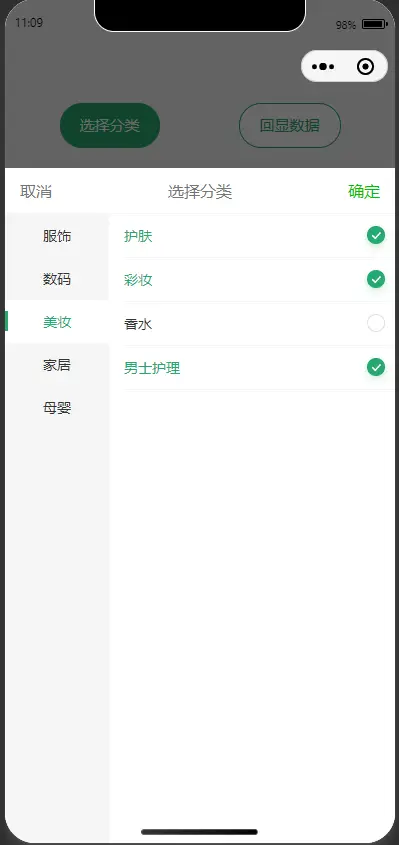- 两级分类树选择器组件,支持单选/多选、数据回显、遮罩弹层。