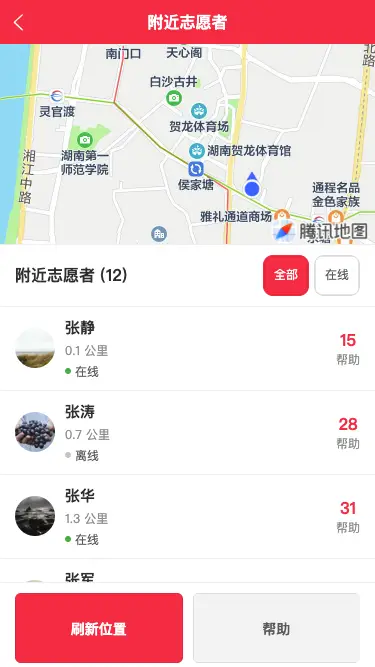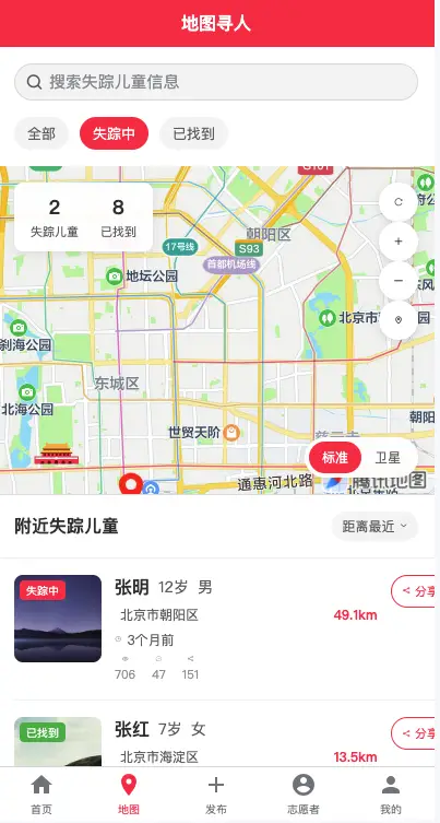 - 地图 - 失踪地点标记、区域搜索、志愿者分布
