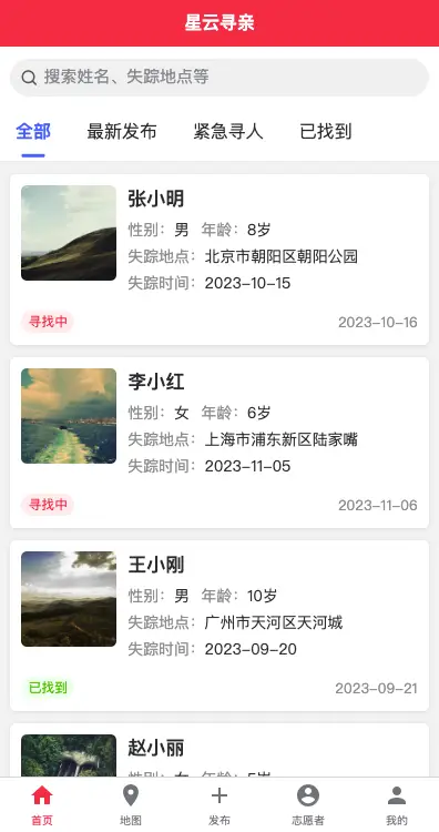 星云丢失儿童平台是一个专注于寻找失踪儿童的平台,提供从发布信息到志愿者协助再到地图定位的完整功能