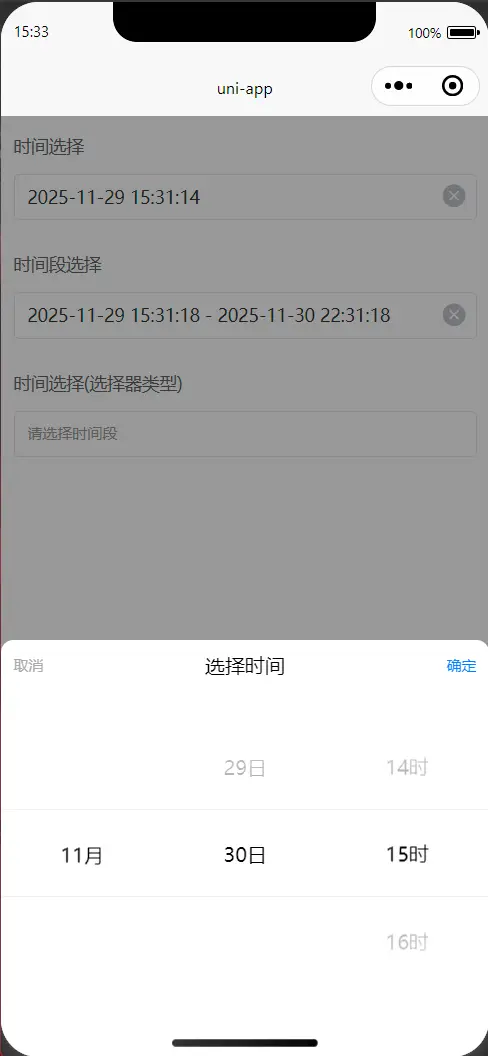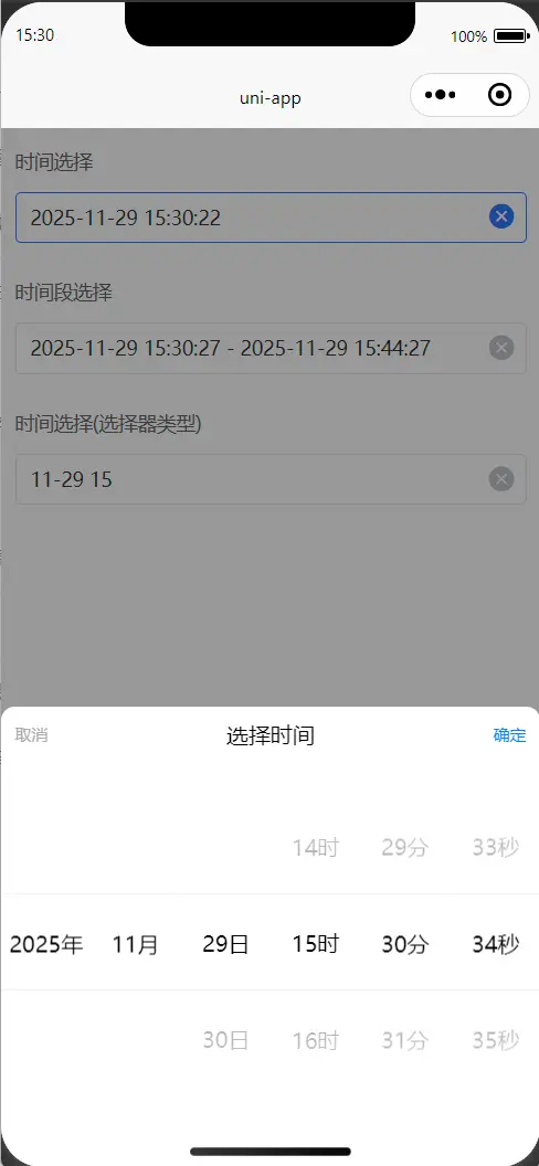 ⚠️ 本组件基于官方 uni-popup 与 picker-view 构建,兼容 H5、小程序、App 多端。