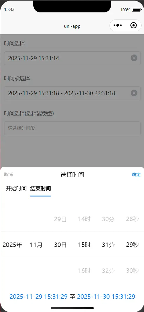 - ✅ 支持开始/结束时间区间选择(范围选择)