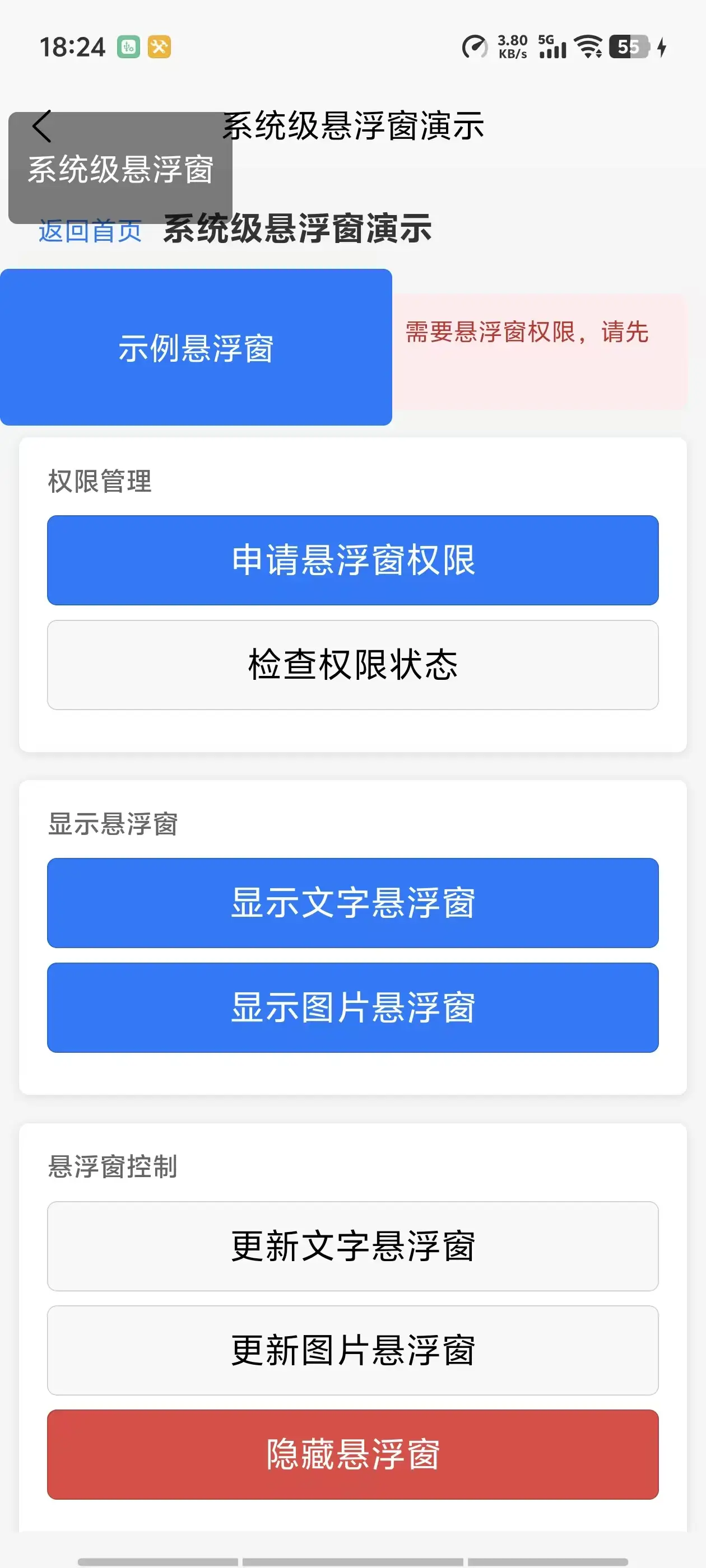 这是一个支持系统级和应用内悬浮窗的 uni-app UTS 插件,专为 Android 平台优化设计。该插件提供了灵活的悬浮窗解决方案,让开发者能够轻松实现各种场景下的悬浮窗需求。