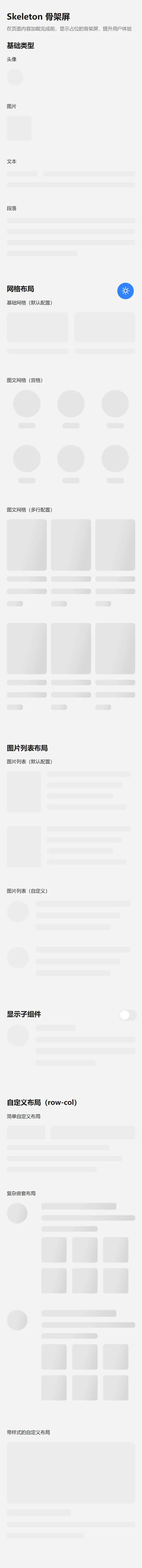 在页面内容加载完成前,显示占位的骨架屏,提升用户体验。支持多种基础类型、网格布局、自定义布局等,兼容uniapp/uniappx。