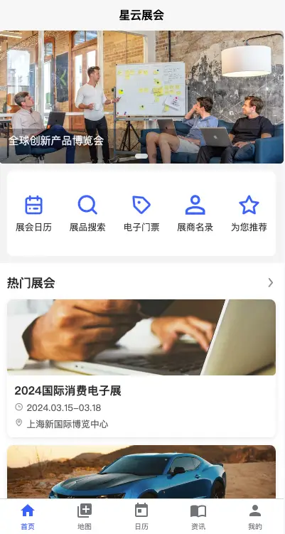 - 首页 - 展会轮播、功能入口、热门展会、精选展品