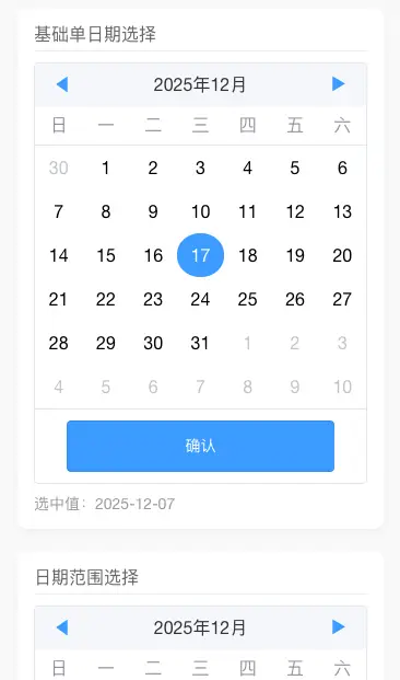 YYYY-MM-DD,非法格式(如2025-13-01、2025-02-30)会被判定为禁用日期; - 范围选择时,若先选结束日期、后选开始日期,组件会自动交换顺序,保证开始日期 ≤ 结束日期;