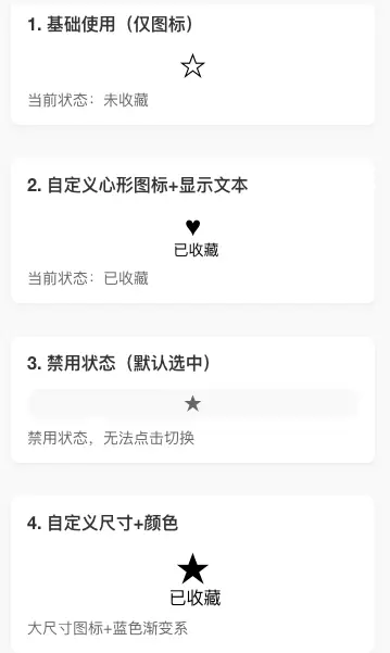 | normalIcon | string | ☆ | 未选中状态图标(支持字体图标、文本符号,如♥、iconfont图标) |