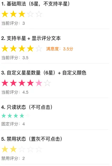 A:半星模式下,评分值以 0.5 为步长(如 1.5、2.5),这是组件默认的半星评分逻辑,符合通用评分场景的交互习惯。