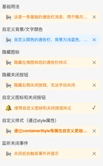 - 关闭按钮点击后会隐藏整个通告栏,如需重新显示可通过父组件控制组件的