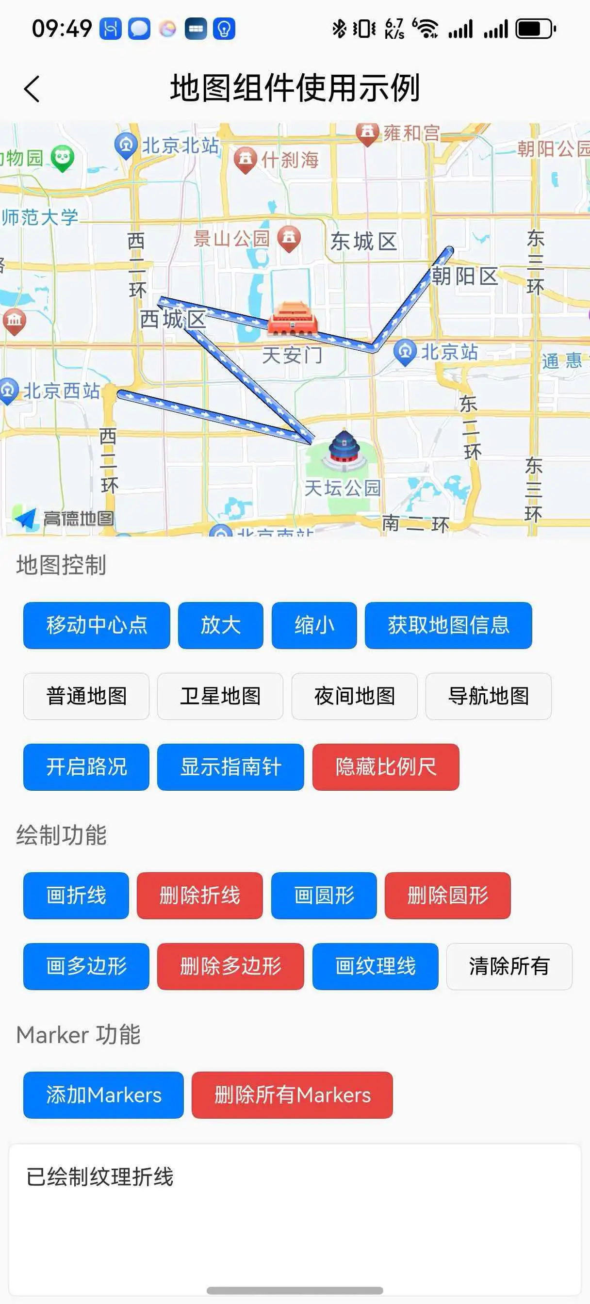 定位功能:单次定位+持续定位+后台定位地图功能:控制以及绘制线+绘制圆+绘制多边形+绘制marker,地图上的多个marker可以同时显示气泡搜索功能:路线规划接口,地理信息查询,逆地理信息查询,行驶距离测量导航功能:驾车导航、步行导航、骑行导航、货车导航(鸿蒙端高德本身sdk目前不支持骑行/步行导航)TTS功能: ios 安卓 鸿蒙 三端都支持语音播报功能- 关于后台定位,开始持续定位时,会去申请后台定位权限,申请成功后,即使app退到后台,定位也会继续。如果用户没同意后台定位权限。那就得自己做界面提示用户,让用户去设置界面手动去设置允许后台(始终)定位权限了