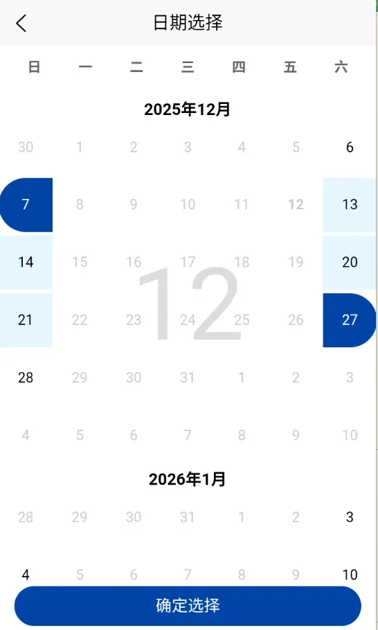 - 支持:日期范围,单选,数量控制,单双日、工作日。
