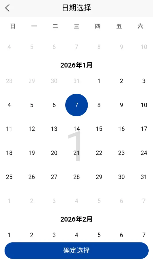 可在弹窗中使用,用scroll-view包裹。 由于周几会悬浮置顶,在非微信小程序测试不全屏状态显示效果不好,建议全屏使用本组件,本示例是在新页面中使用,选择日期后再返回上一页,使用缓存获取日期即可。