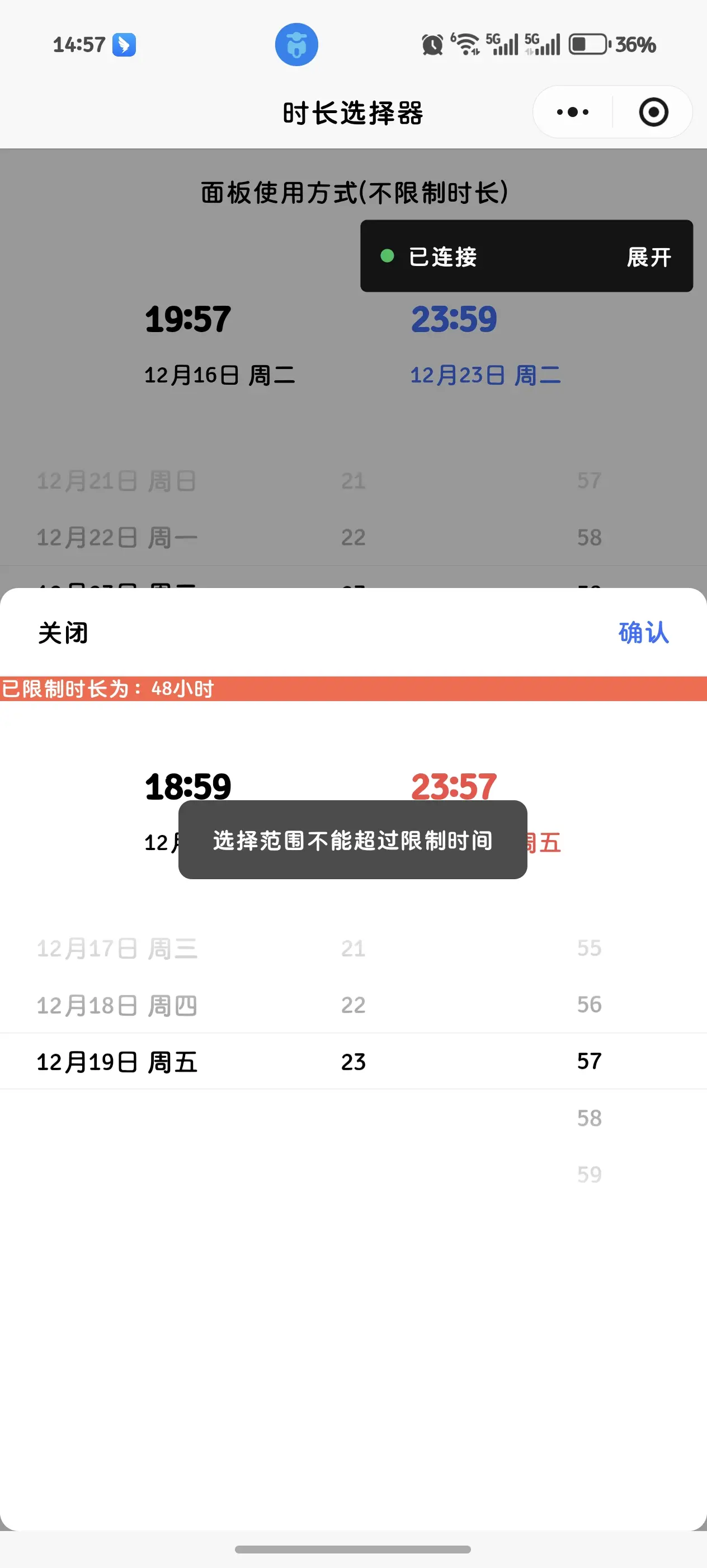 通过暴露给外部的 onConfirm 方法来触发,返回最终正确的时间范围