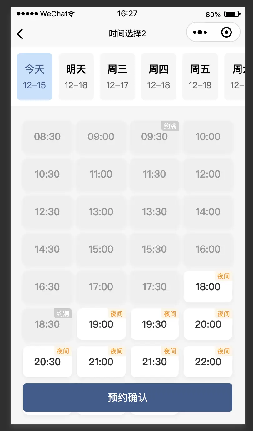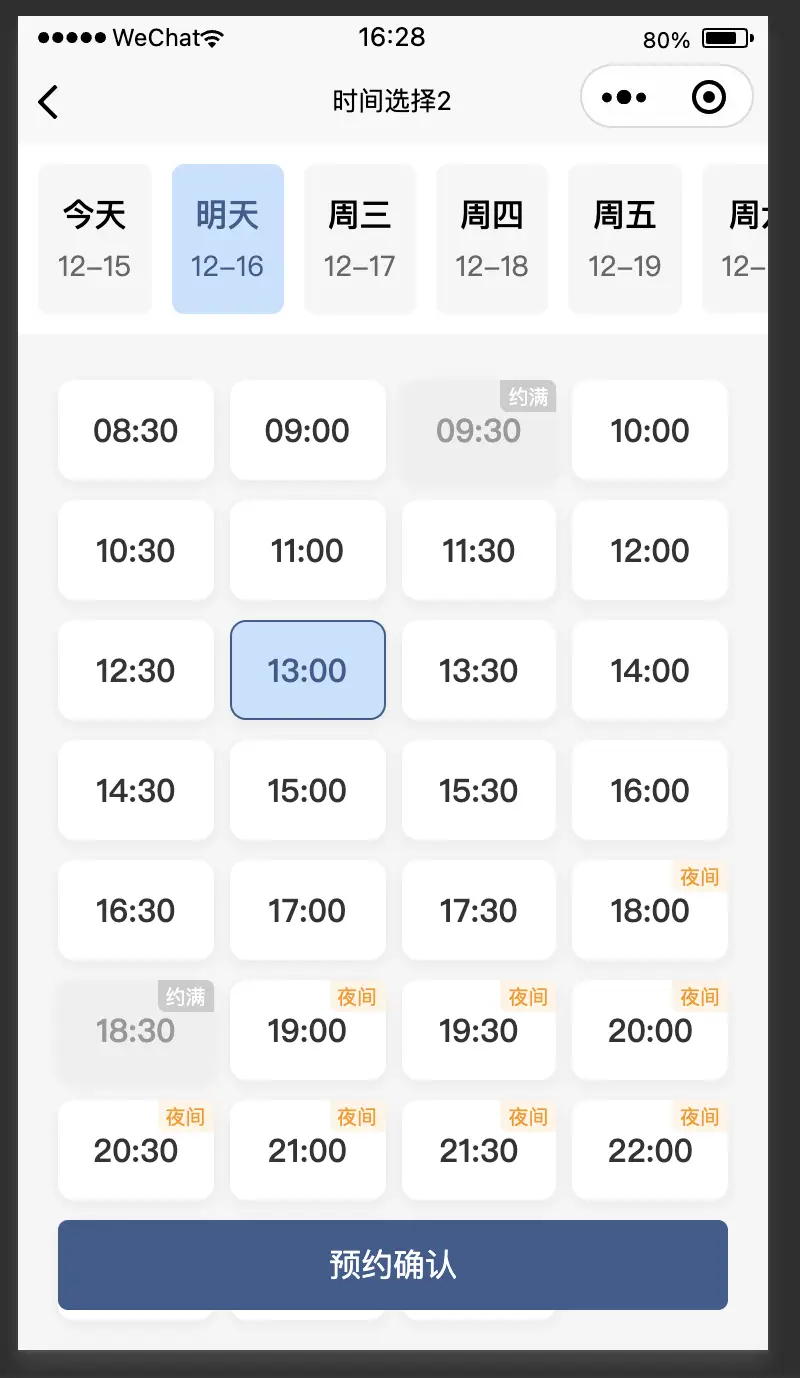 * endTime: '23:30', // 可选,结束时间,格式 "HH:mm" 默认为 '23:30'