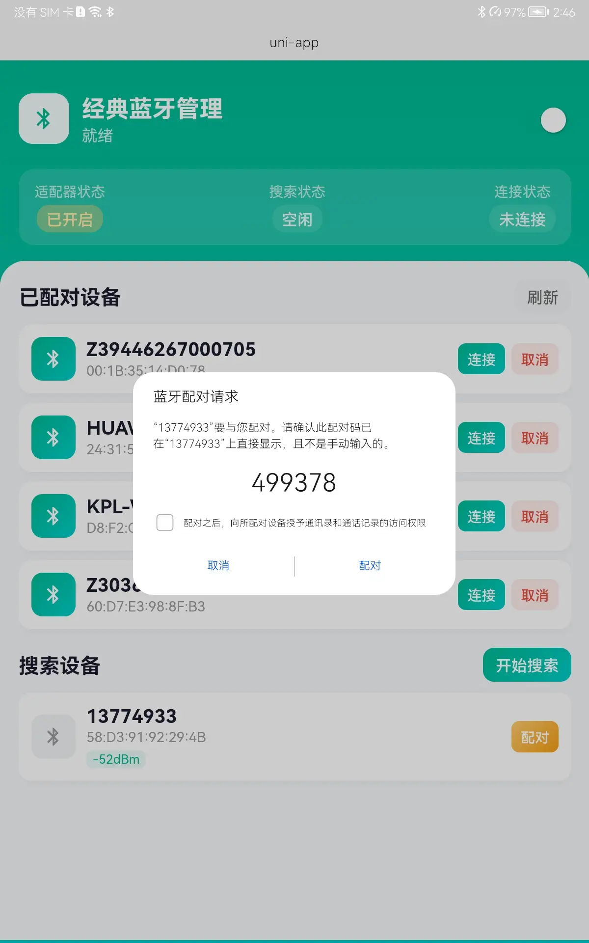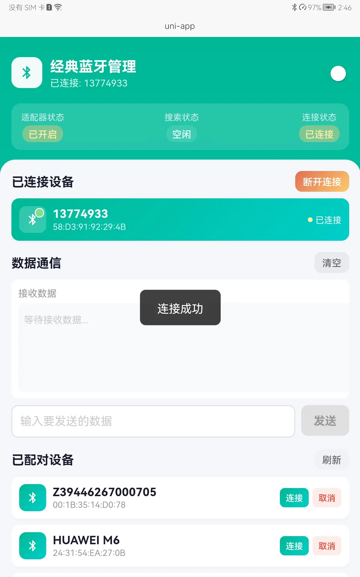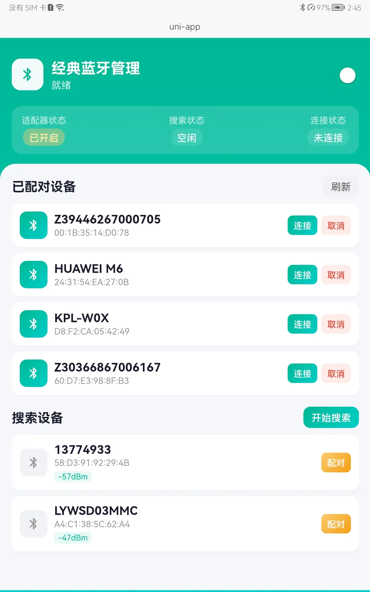 - 完整的蓝牙管理:设备搜索、配对管理、连接管理、数据收发