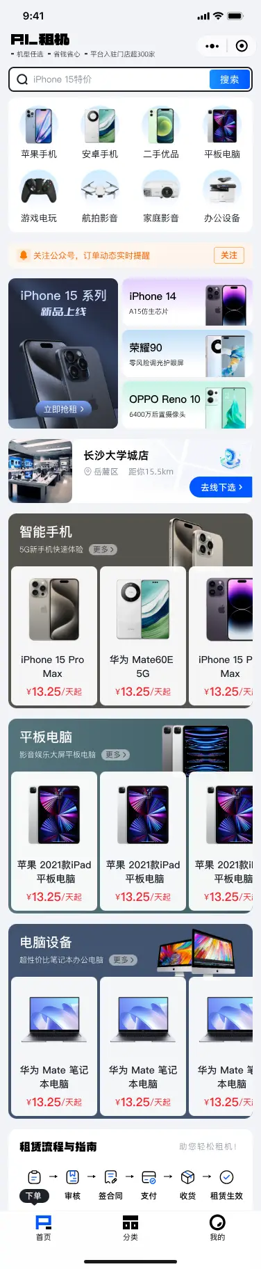 - 首页底部设有“租赁流程与指南”,图文详解从下单到归还的每一步。