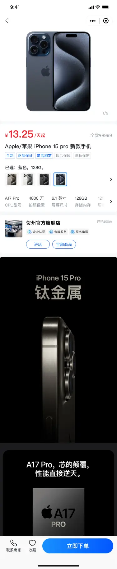 - 点击“立即下单”,选择颜色、存储容量、租赁时长。