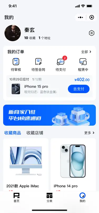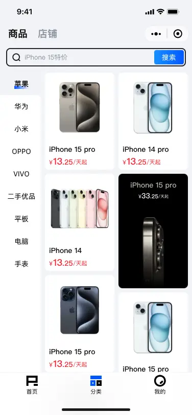 - 分类导航:顶部“商品”“店铺”切换,底部“首页 / 分类 / 我的”三栏布局,功能直达。