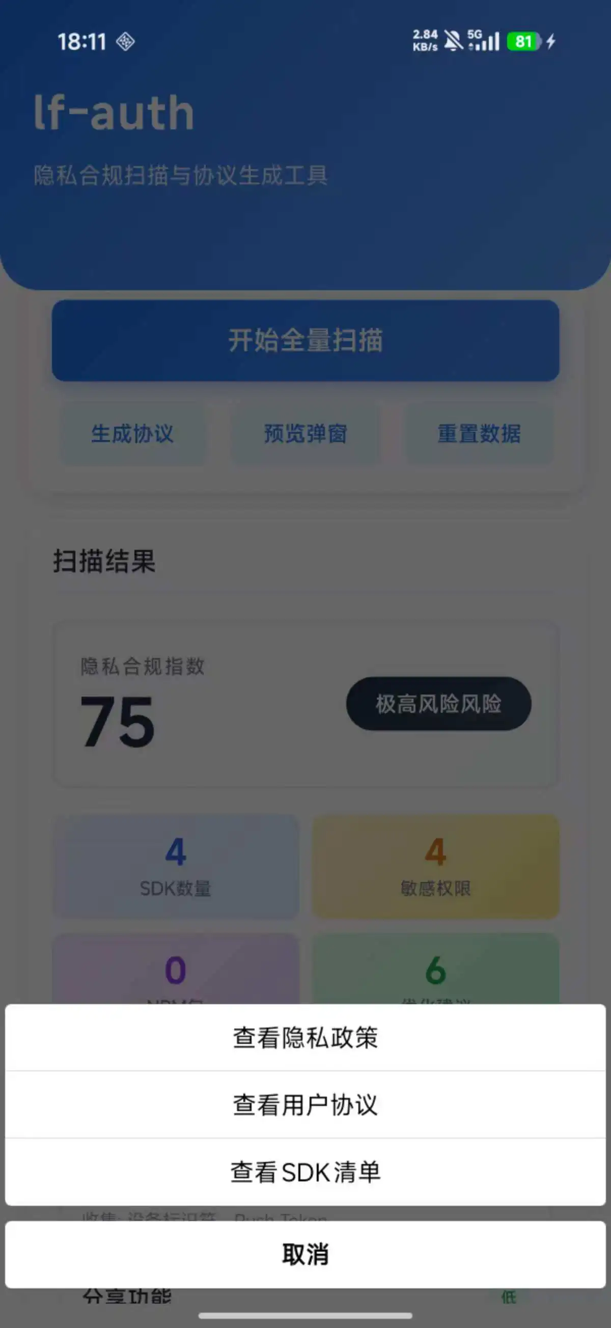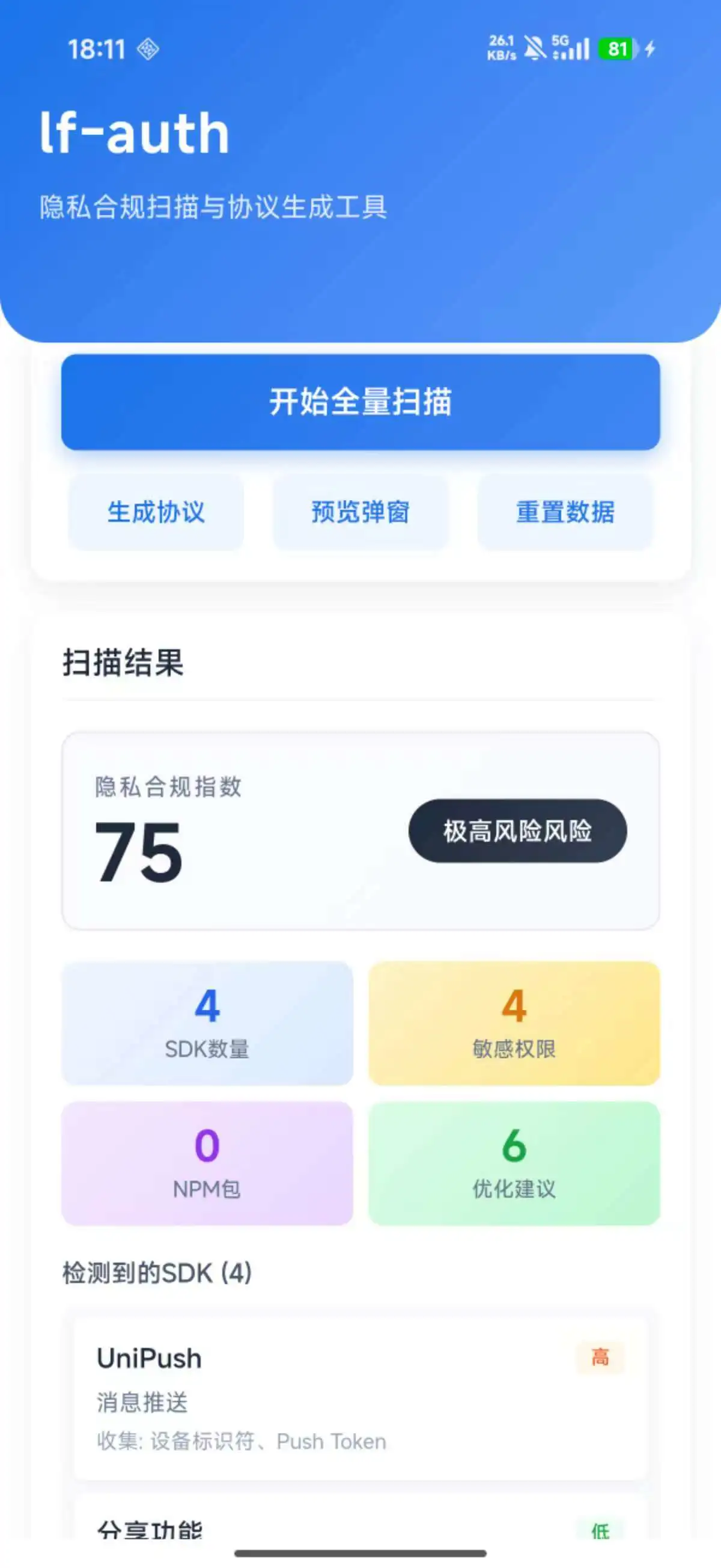 - 隐私政策:根据扫描结果自动生成符合规范的 HTML 隐私协议