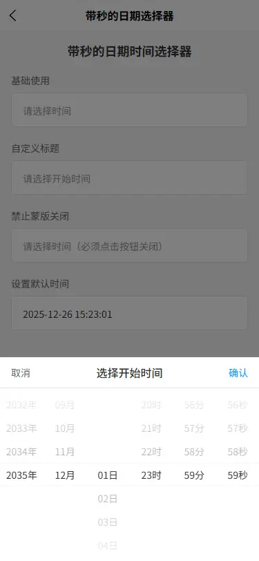 datetime-picker-second 是一个精确到秒的日期时间选择器组件,支持年月日时分秒六级联动选择,自动处理月份天数变化。