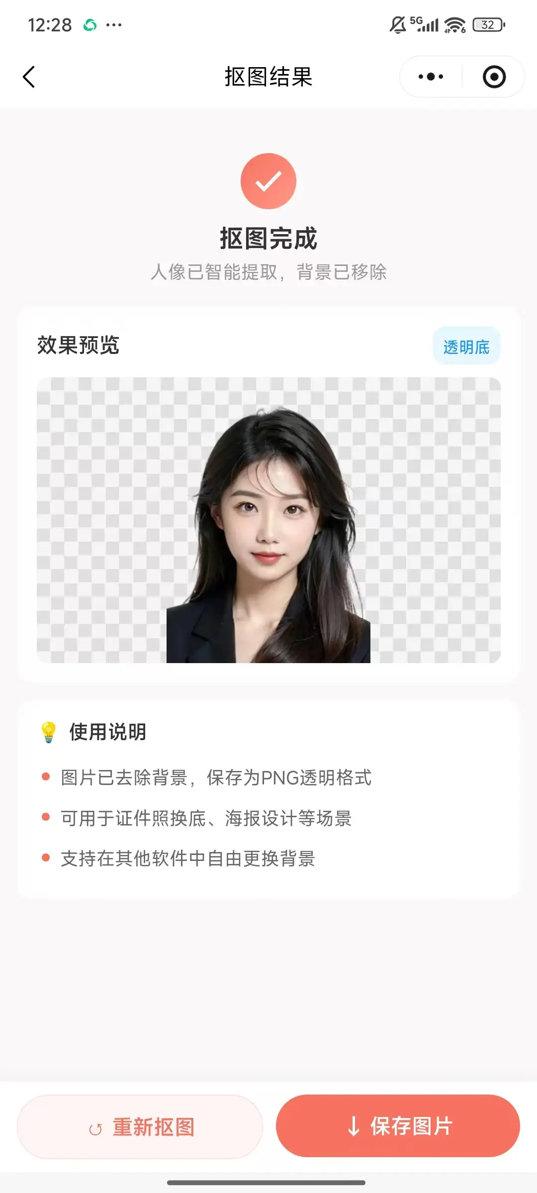 - ✅ 人像抠图 - AI 智能分离人物与背景,输出透明底PNG