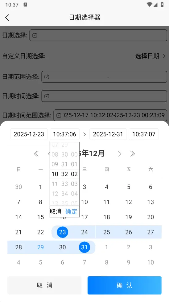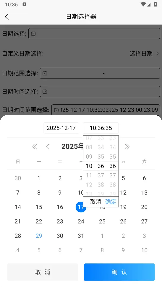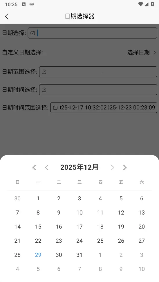 支持日期、日期范围、日期时间、日期时间范围等类型的日期选择