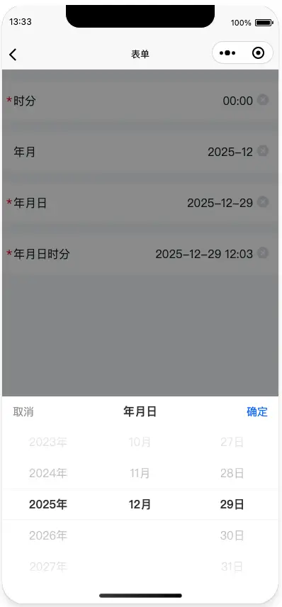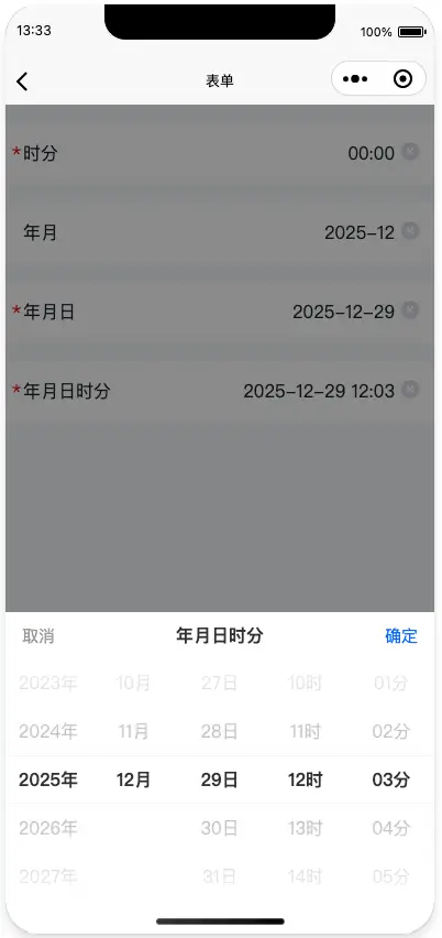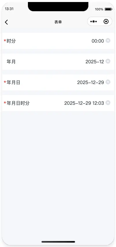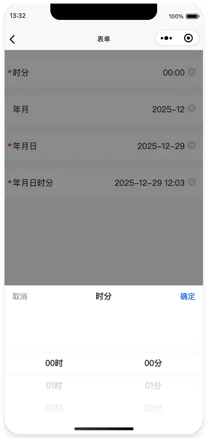 <xf-fm-date-selector customClass="b-mt16" :required="true" title='时分' mode="time" v-model:date="formData.time1">