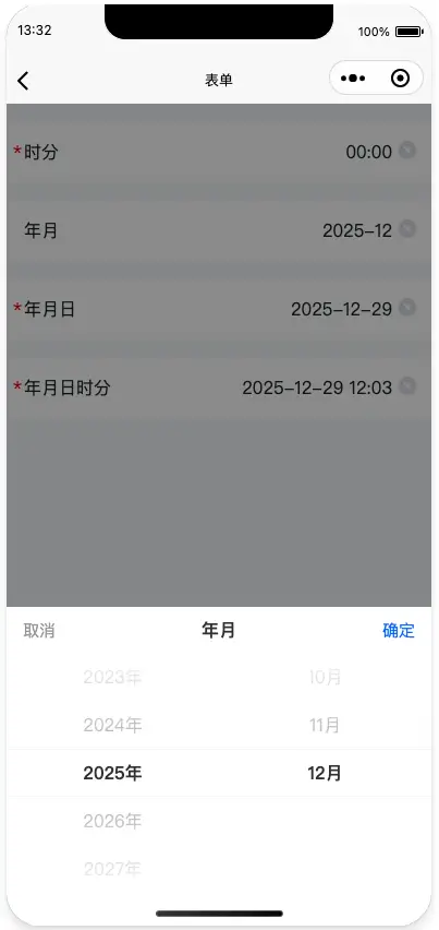 <xf-fm-date-selector customClass="b-mt16" :required="false" title='年月' mode="year-month"