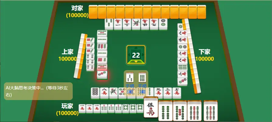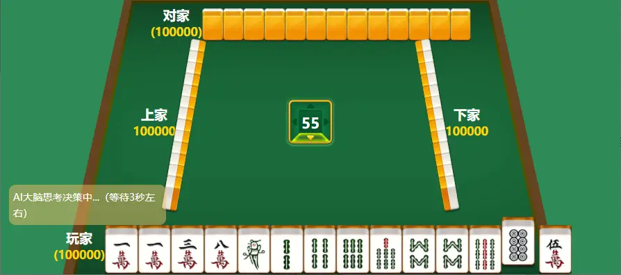 该游戏为人机对战麻将游戏,AI为玩家提供出牌策略指导,提升玩家麻将水平,实现百战百胜。