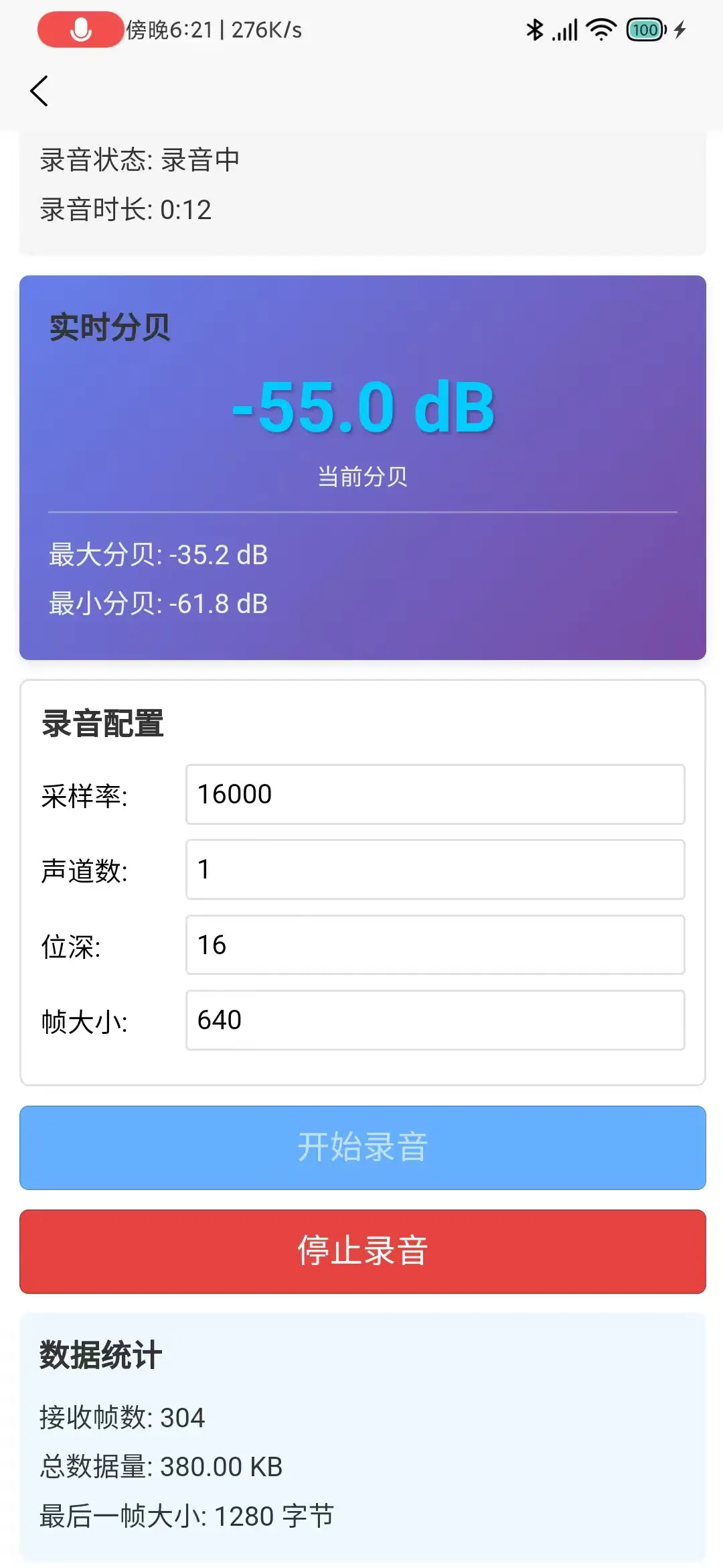 - ✅ 实时分贝计算,每次回调同时返回当前分贝值
