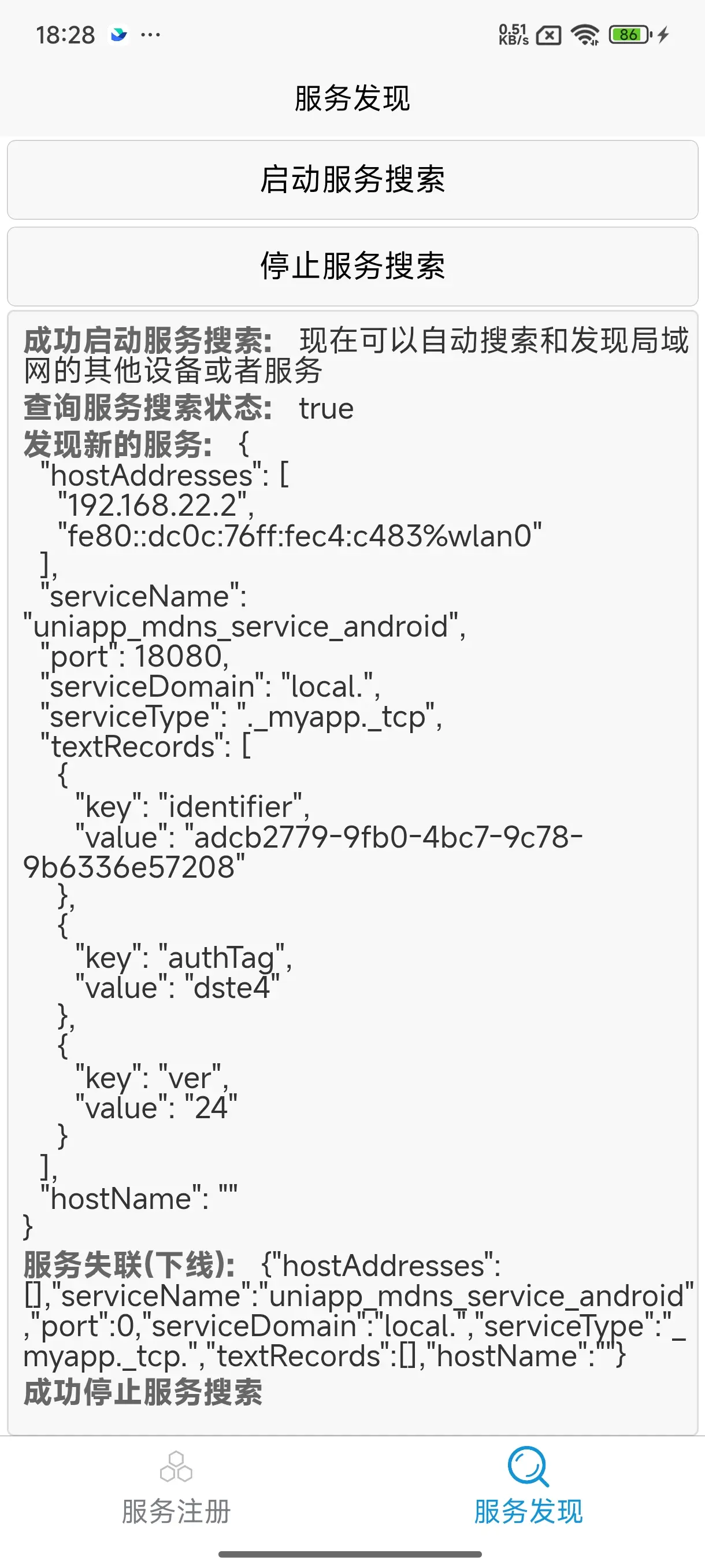 插件支持服务注册发布。服务发布后,同一个局域网的其他设备或者APP就可以搜索的到。