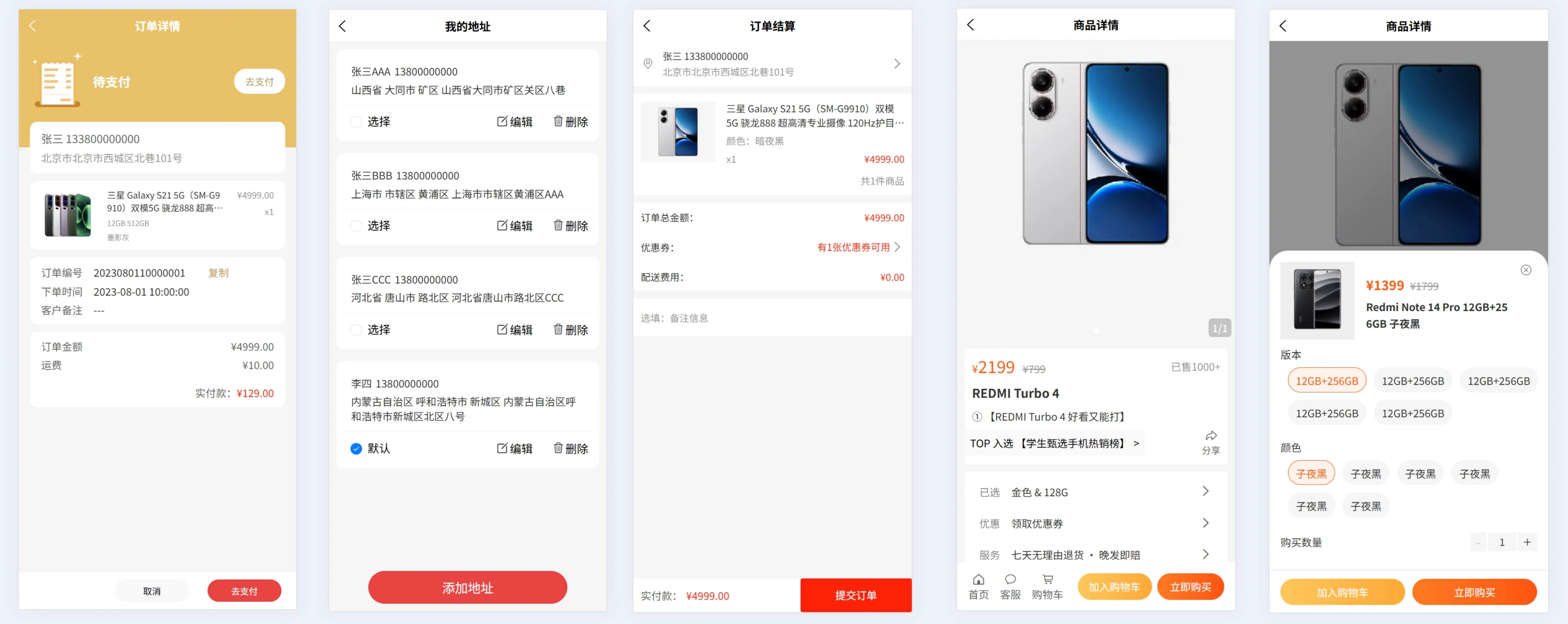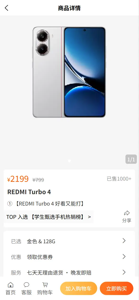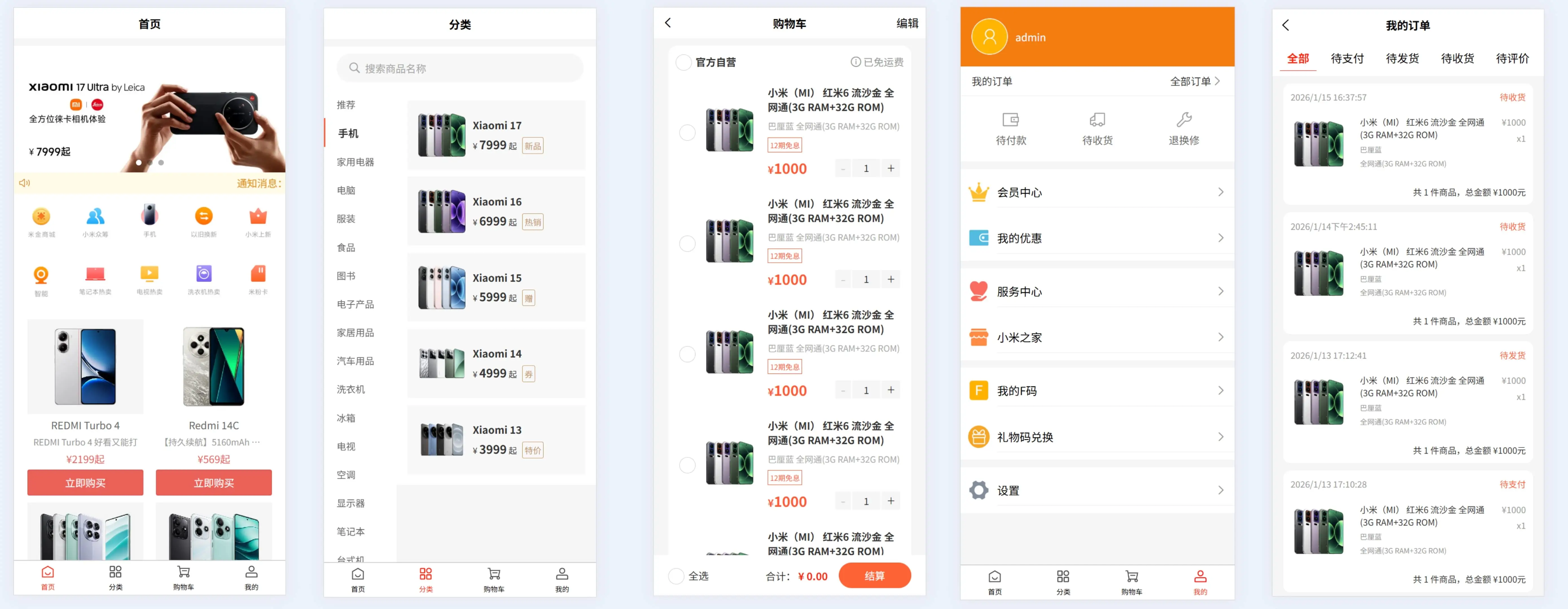 新增首页、分类页、购物车页、我的页、商品详情页、加入购物车页