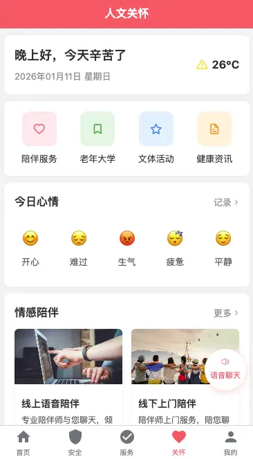 - 新增情感陪伴模块,包含陪伴服务、老年大学线上课堂、文体活动组织等功能