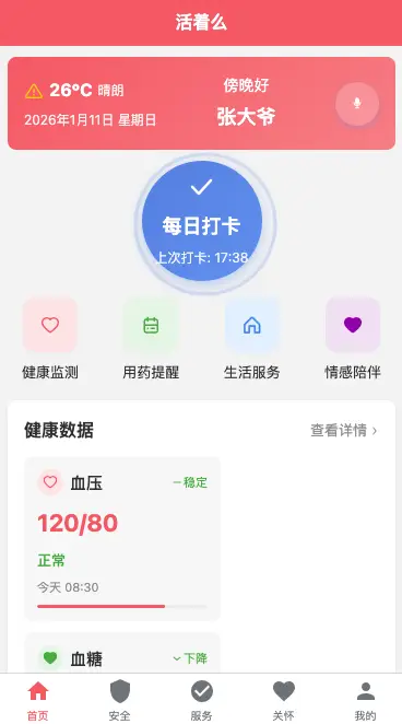 活着么是一个专为老人提供关怀服务的平台,兼具人文关怀和安全保障功能,让老年生活更美好