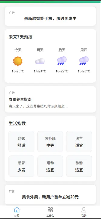 该应用提供全面的天气信息服务,包括实时天气查询、空气质量监测、生活指数建议、天气预警等功能,并集成了广告系统,支持多种广告形式。