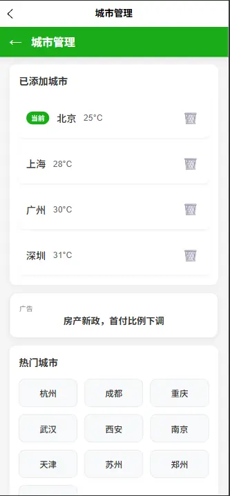 - 城市管理:可添加、删除、切换关注城市