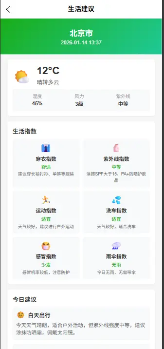 - 生活指数建议:包括紫外线、穿衣、运动、洗车等指数
