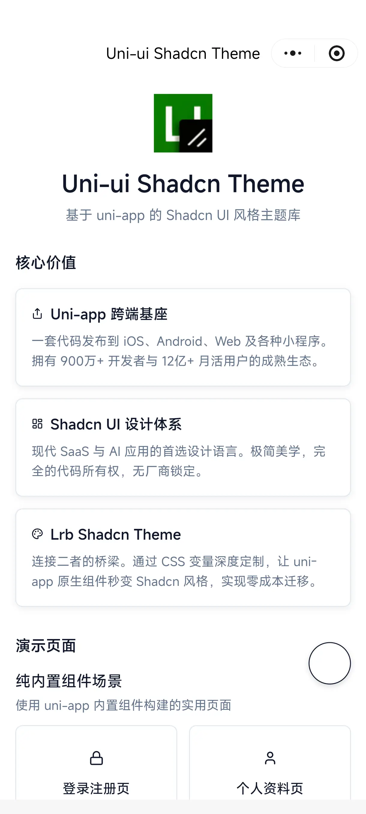 - 🎨 Shadcn 风格化:通过 CSS 变量覆盖 uni-app 内置组件和 uni-ui 组件