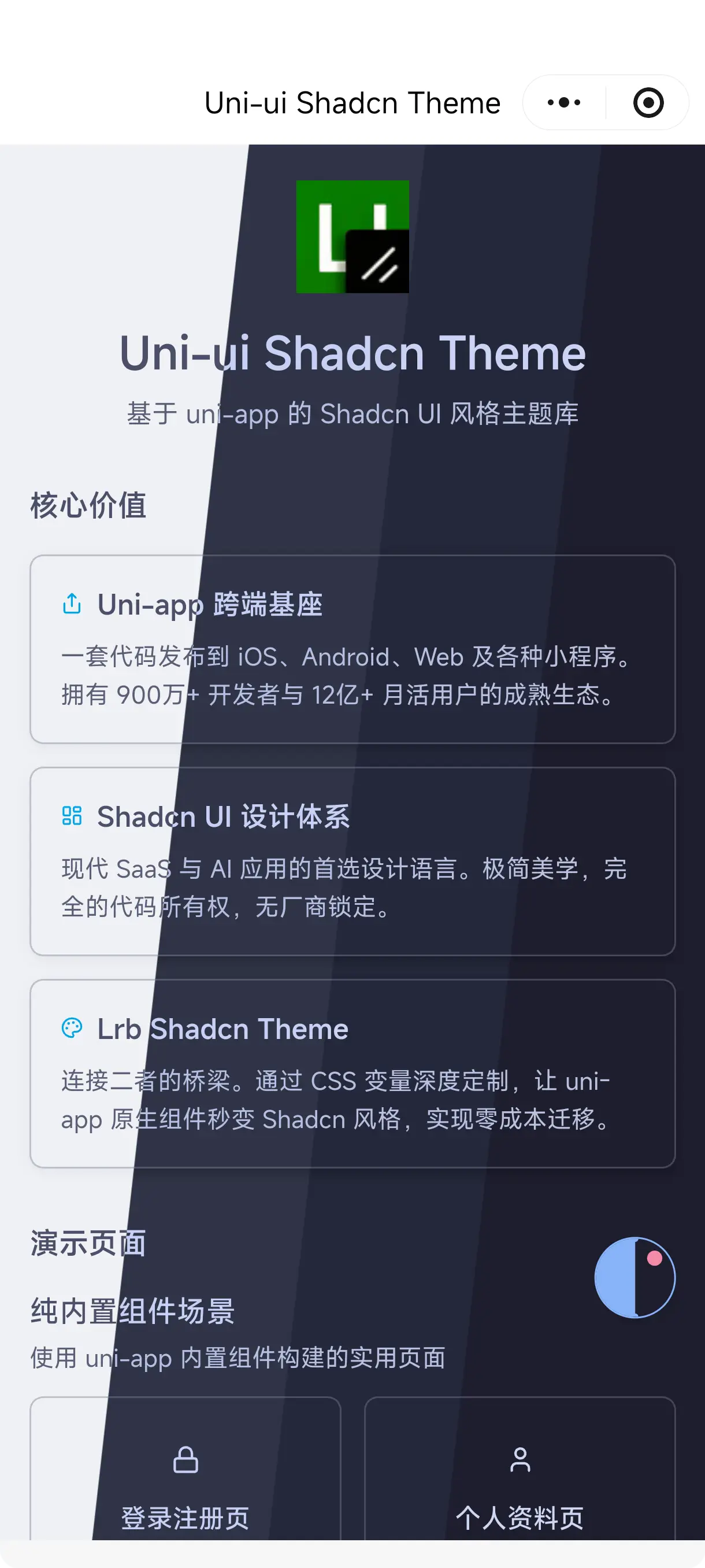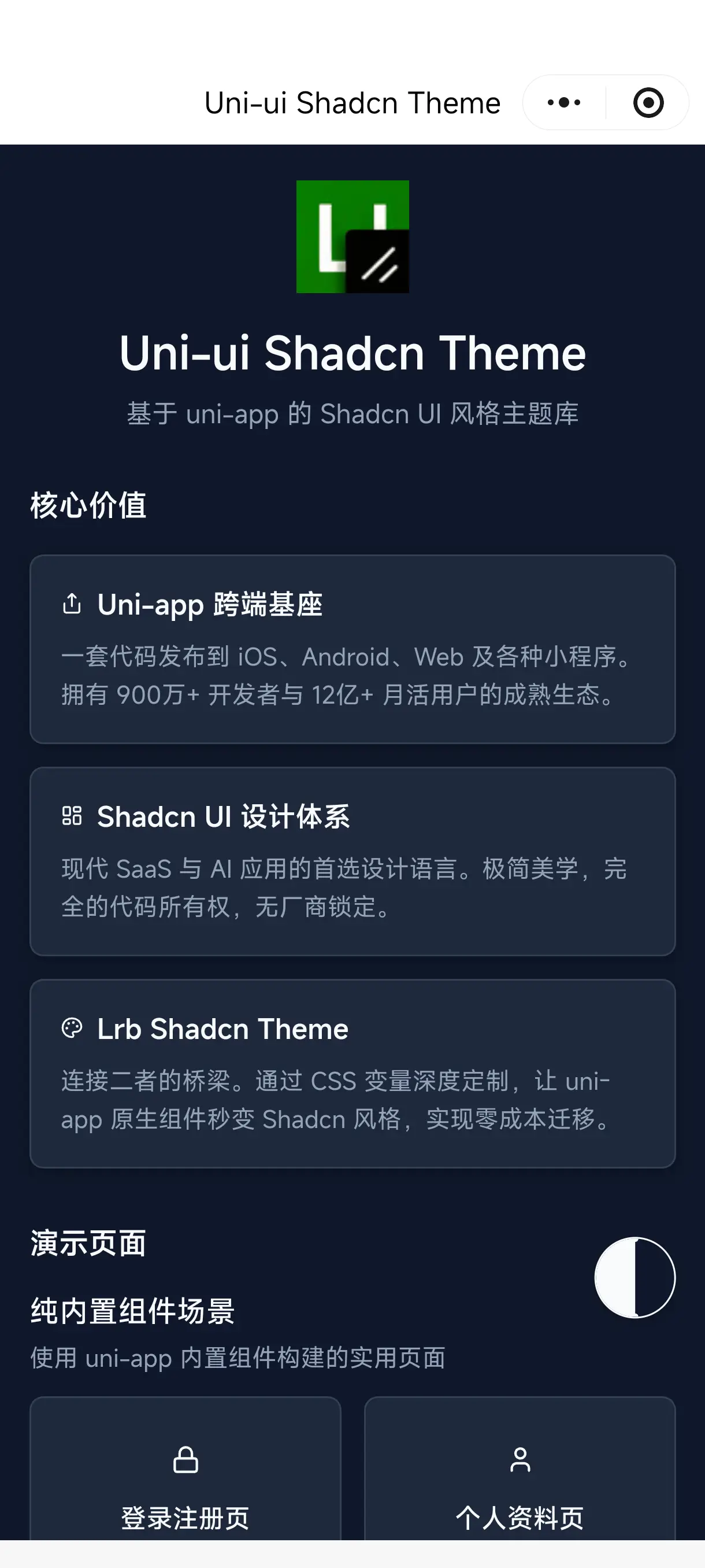 本插件是连接二者的桥梁。我们没有重新造轮子编写一套新的组件库,而是通过深度定制的 CSS 变量和样式覆盖,将 uni-app 原生组件和 uni-ui 扩展组件“整容”为 Shadcn 风格。